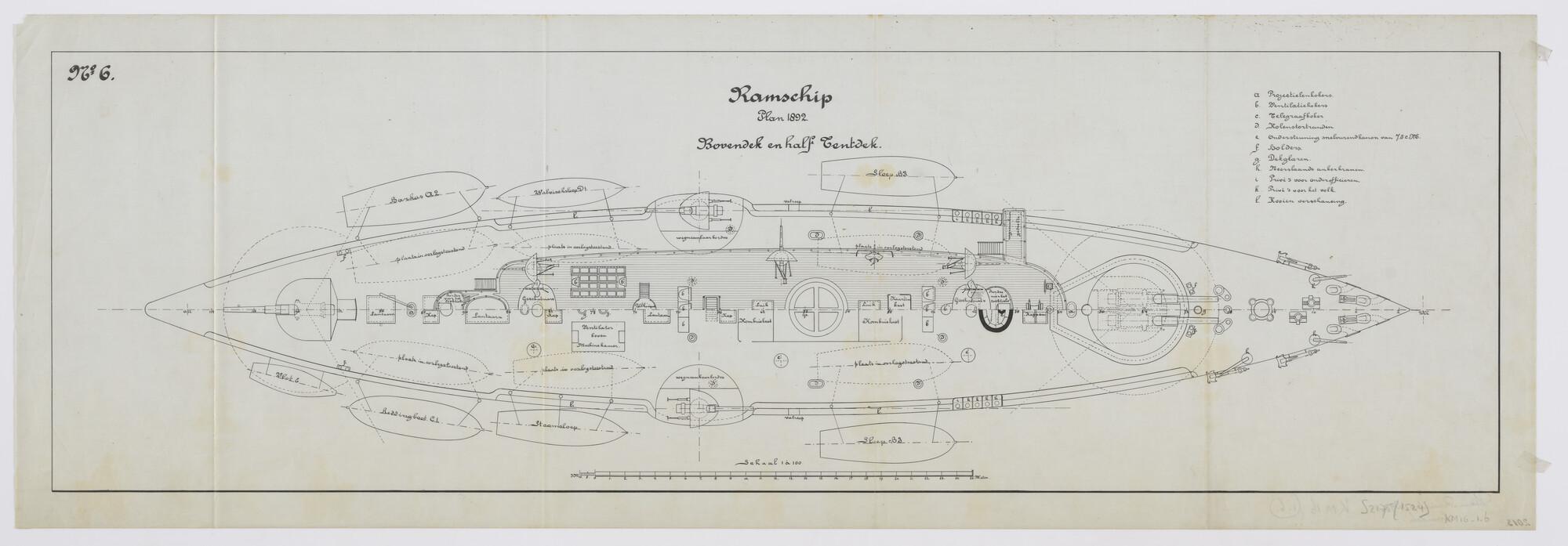 Gedetailleerde indelingstekening van het bovendek en half tentdek van het ramschip plan 1892, model voor de pantserschepen Hr.Ms. Kortenaer, Hr.Ms. Piet Hein en Hr.Ms. Evertsen (schaal 1:100).