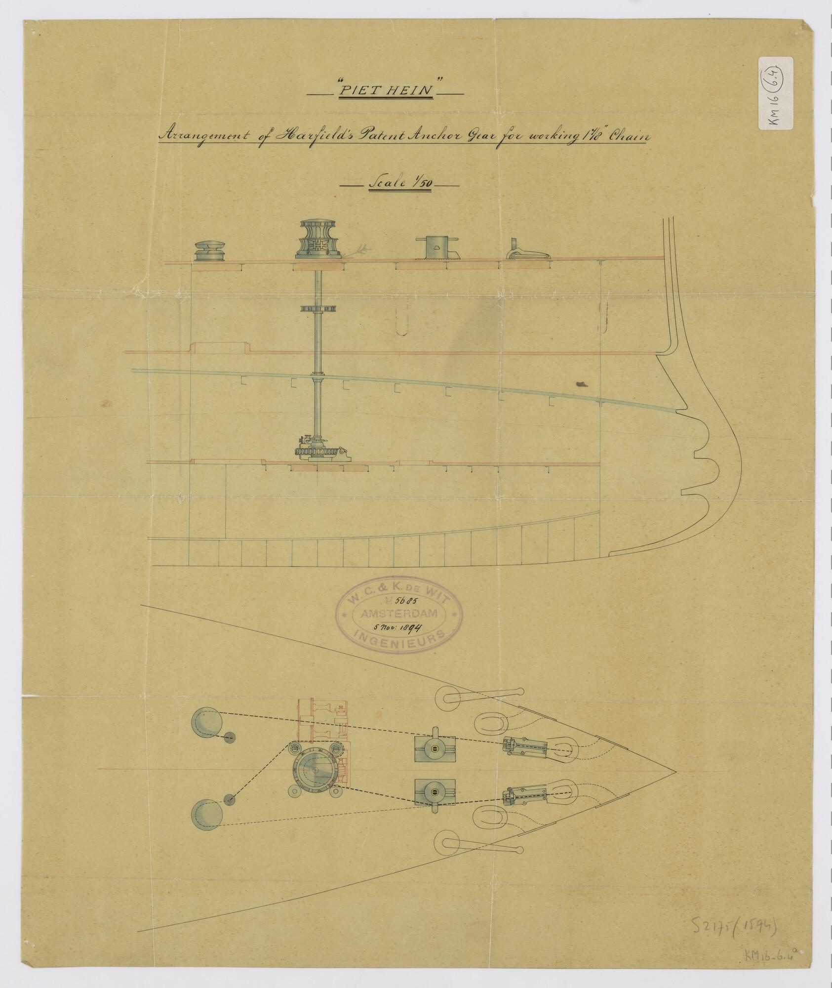 Langsdoorsnede van het voorschip met ram en bovenaanzicht van de bak van het pantserschip Hr.Ms. "Piet Hein". Ankerinrichting met ankerspil en aandrijfas met stoomankermachine op het vóór-koebrugdek (schaal 1:50).