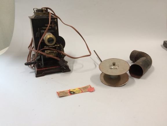 Filmprojector bestaande uit 3 onderdelen en 1 visitekaartje