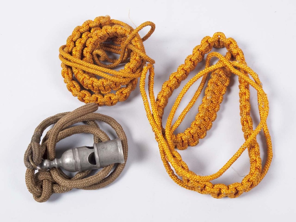 4 objecten, bestaande uit: metalen fluit aan koord, 2 identieke oranje koorden en een mouwembleem