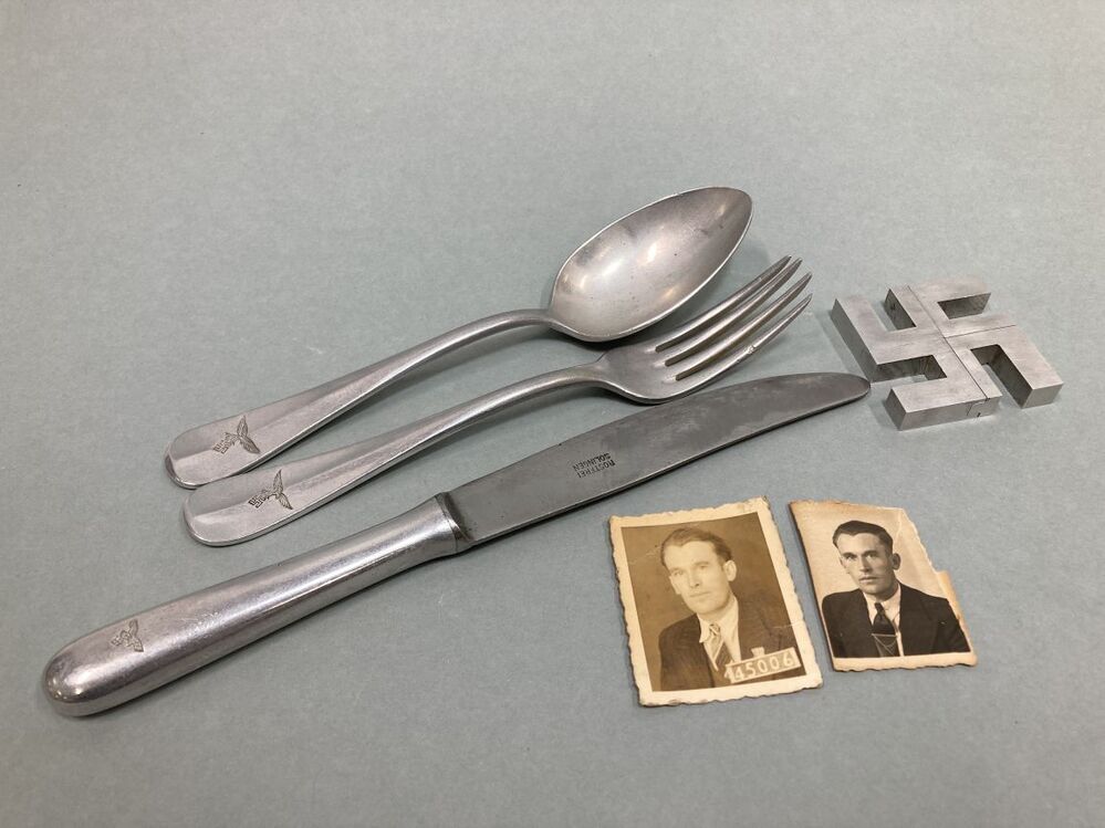 Bestekset, twee foto's en een metalen object van Ruurd de Jong