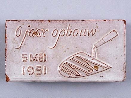 Tegel /baksteen met tekst, 6 jaar opbouw, 5 Mei 1951