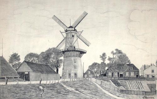 Potloodtekening. Aeolus Molen aan de Kortedijk Vlaar...
