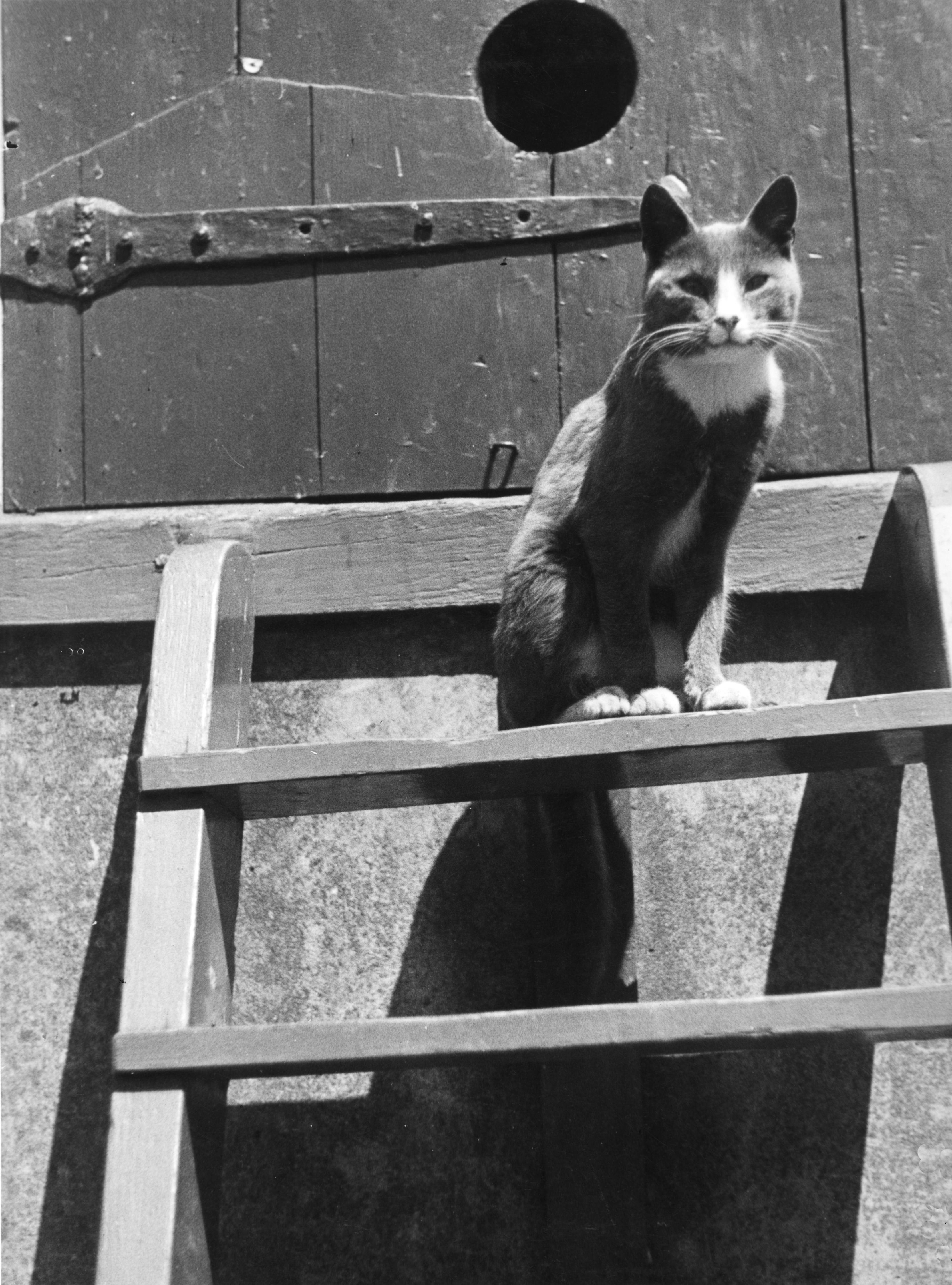Kat op trapje, Enkhuizen, 1942 (zwart-wit foto)