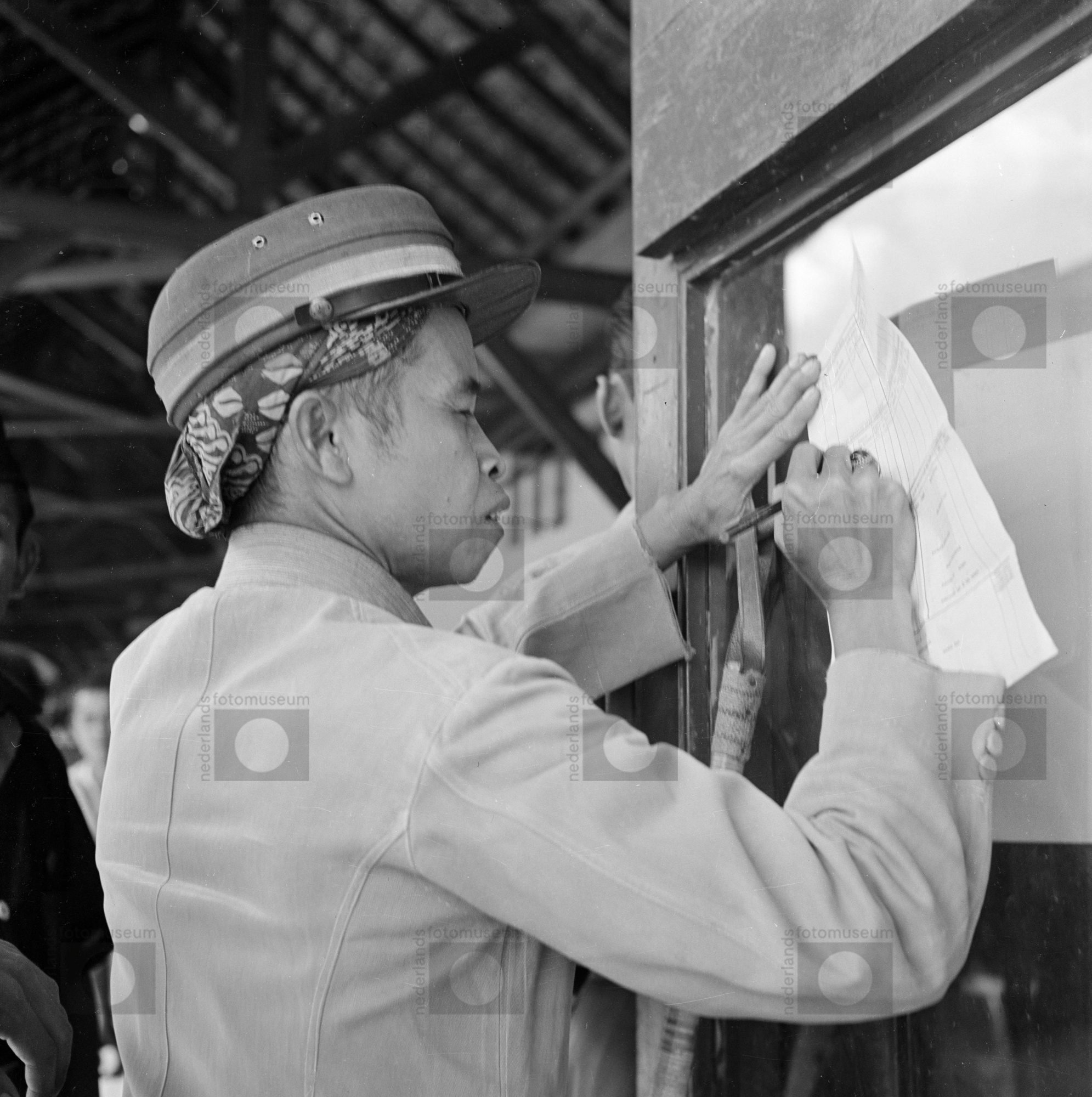 Een geuniformeerde Indonesische vrouw schrijft snel ...