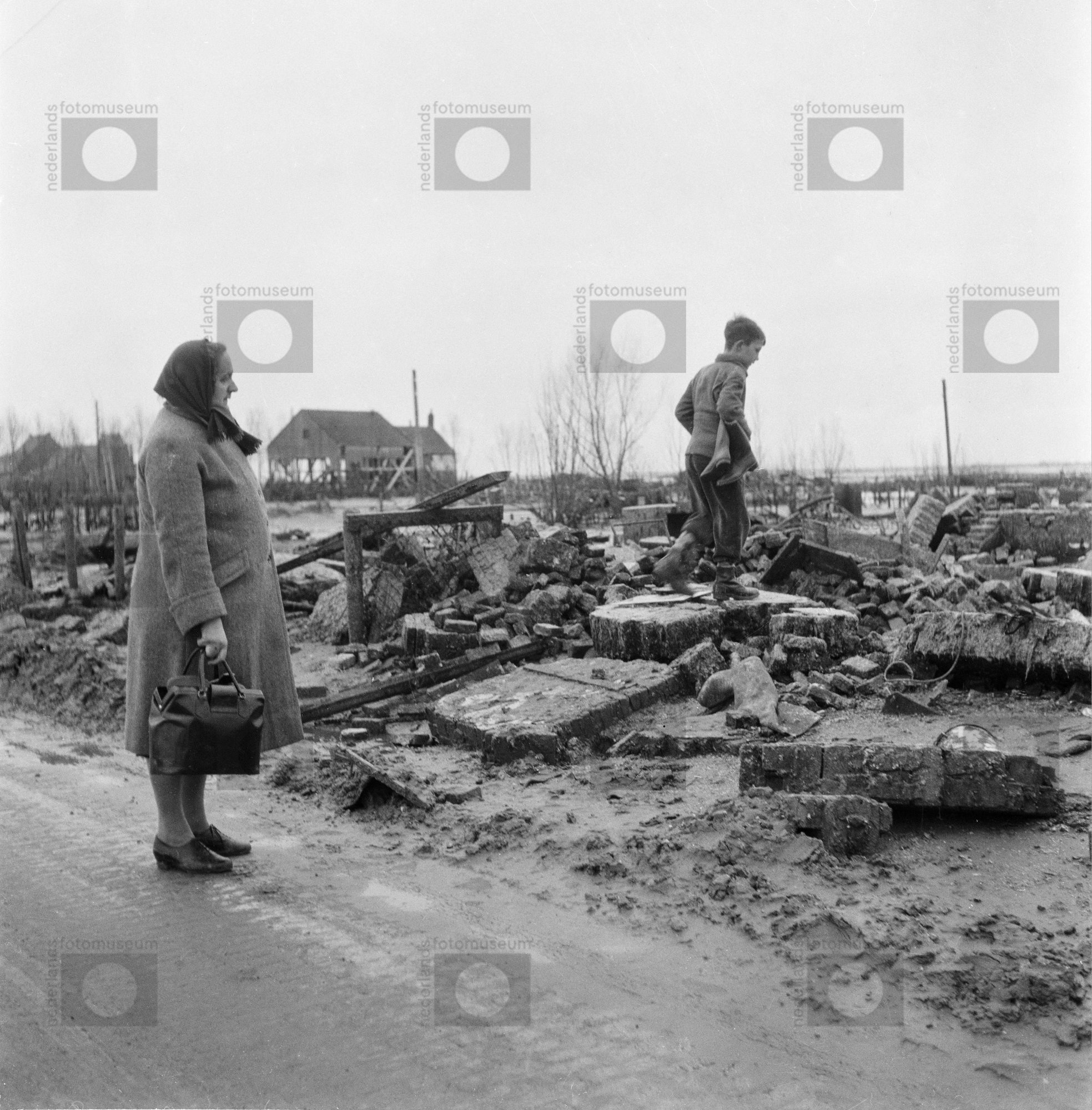 Een vrouw verzamelt in de Hongerwinter brandhout uit...