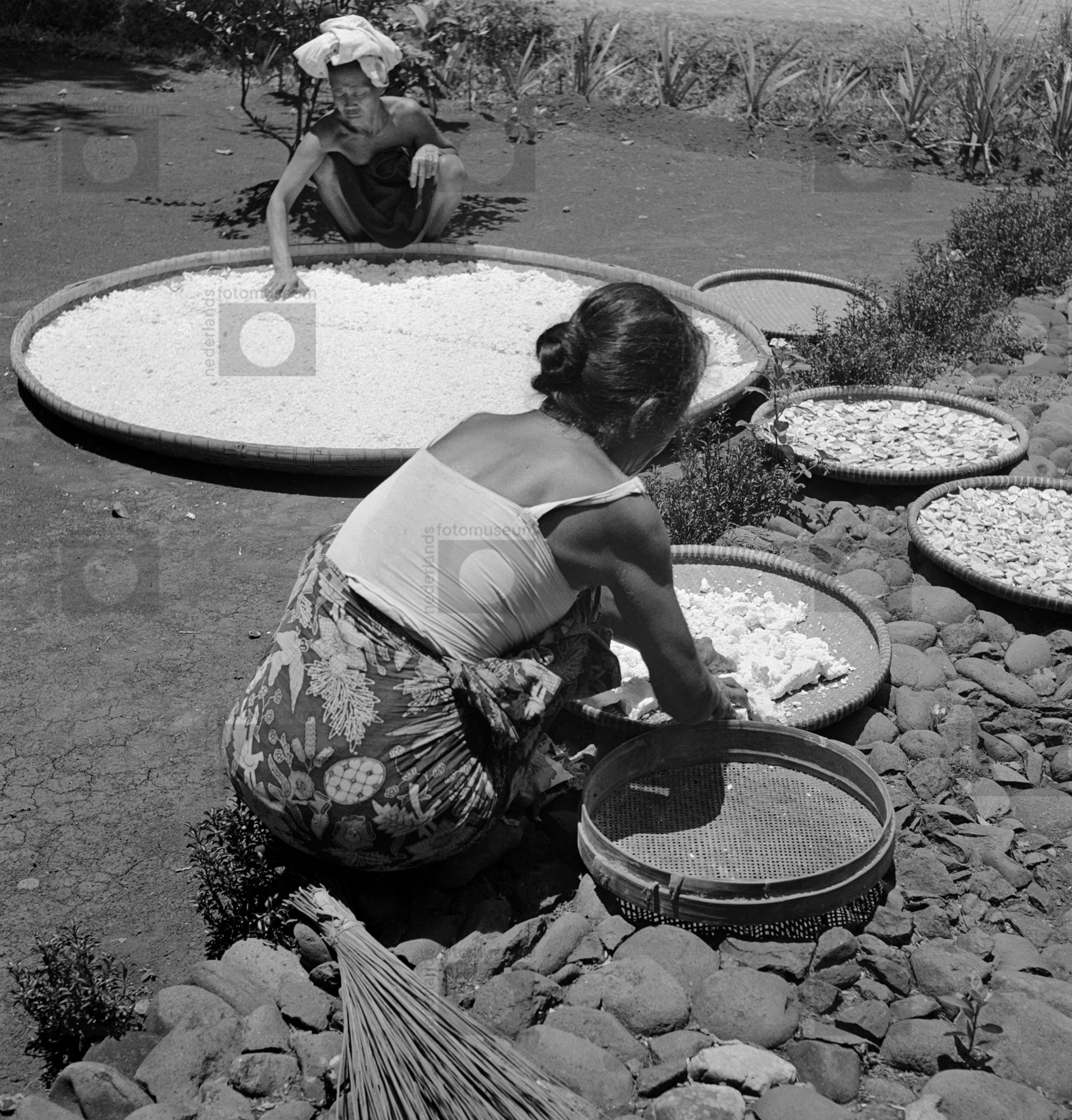 Vrouwen bewerken tapioca-meel in grote gevlochten sc...