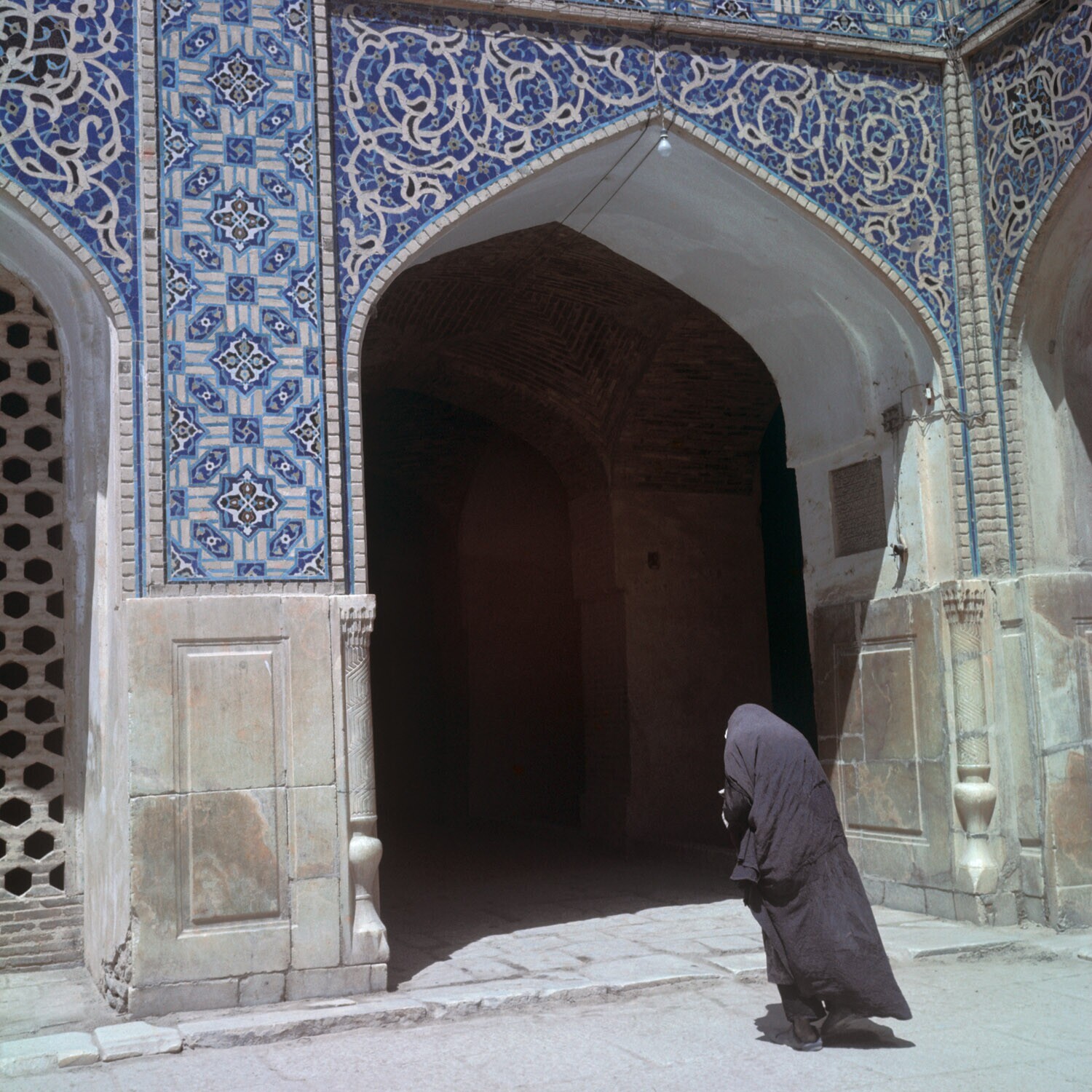 Ingang van de Vrijdagmoskee te Isfahan, gesluierde v...