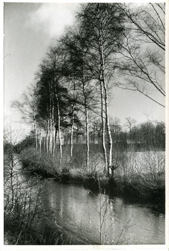Foto in zwart-wit van berken aan een bevroren sloot ...