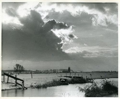 Foto in zwart-wit van ondergelopen land met boerderi...