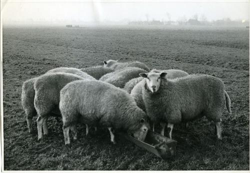 Foto in zwart-wit van schapen bij een voerbak door J...