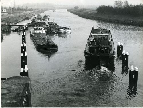 Foto in zwart-wit van binnenvaartschepen met suikerb...