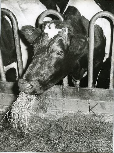 Foto in zwart-wit van een koe aan een voerhek door J...