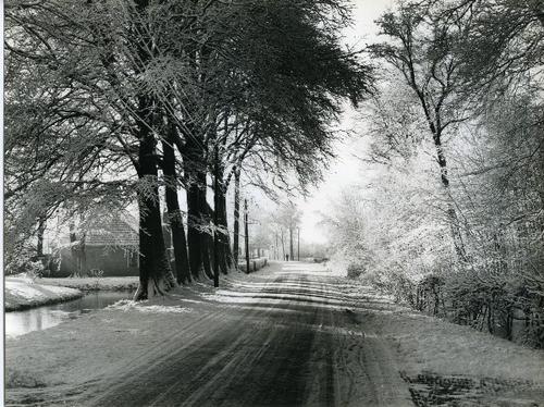 Foto in zwart-wit van een besneeuwde weg met bomen d...