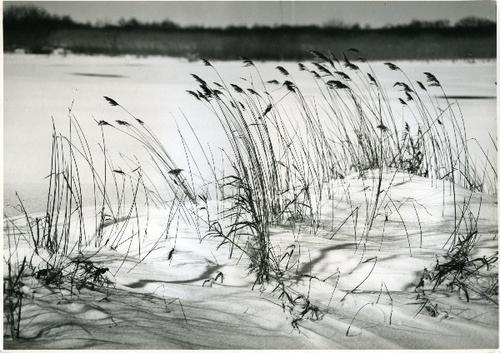 Foto in zwart-wit van riet in de sneeuw door J.D. de...