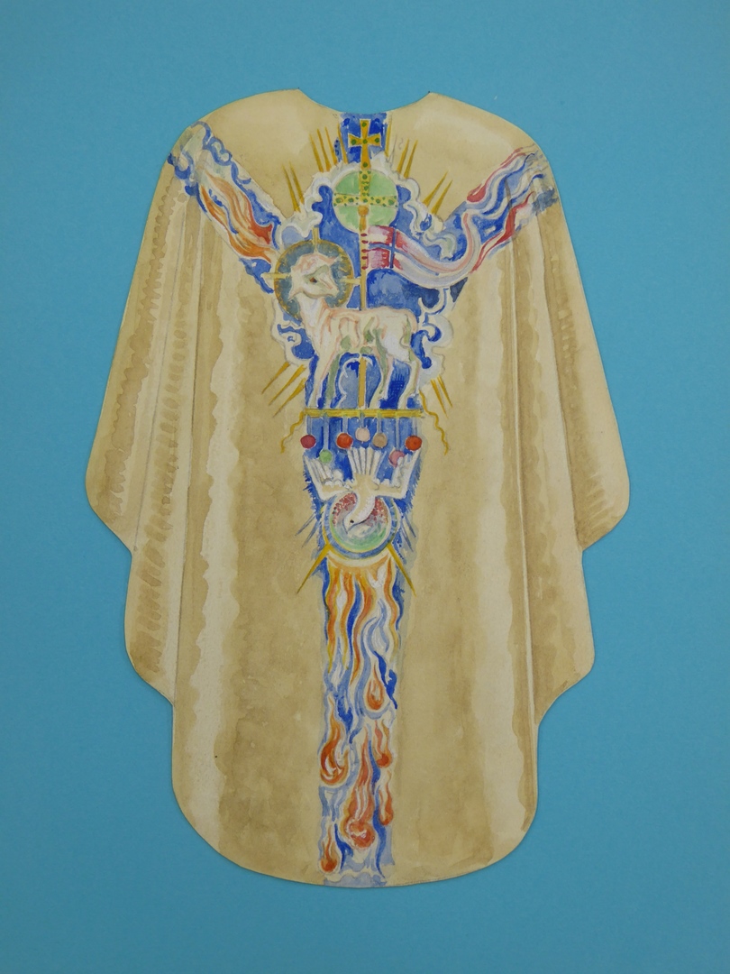 Ontwerp koorkap met het lam, liggend op de bijbel
