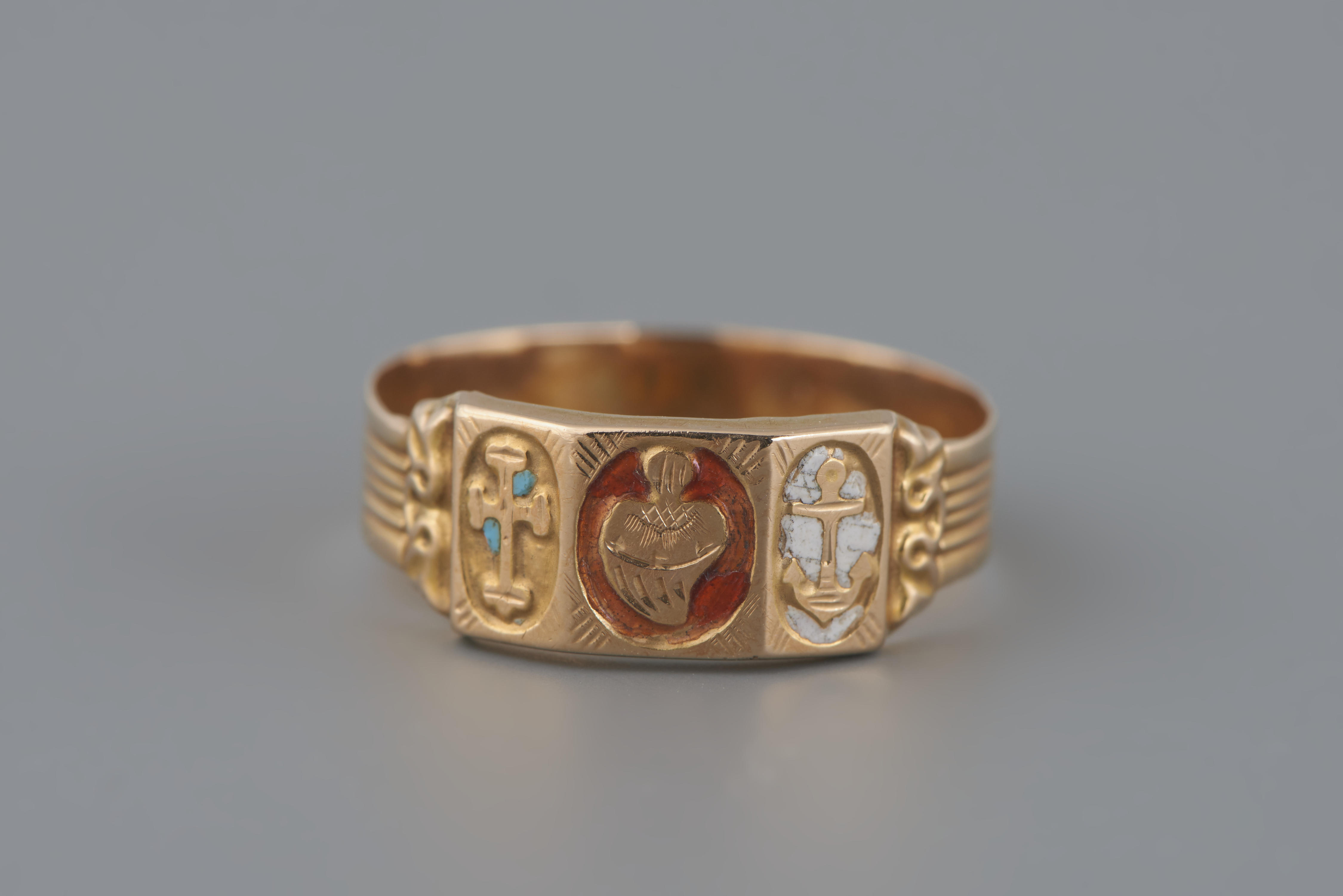 Gouden ring met symbolen voor geloof, hoop en liefde...