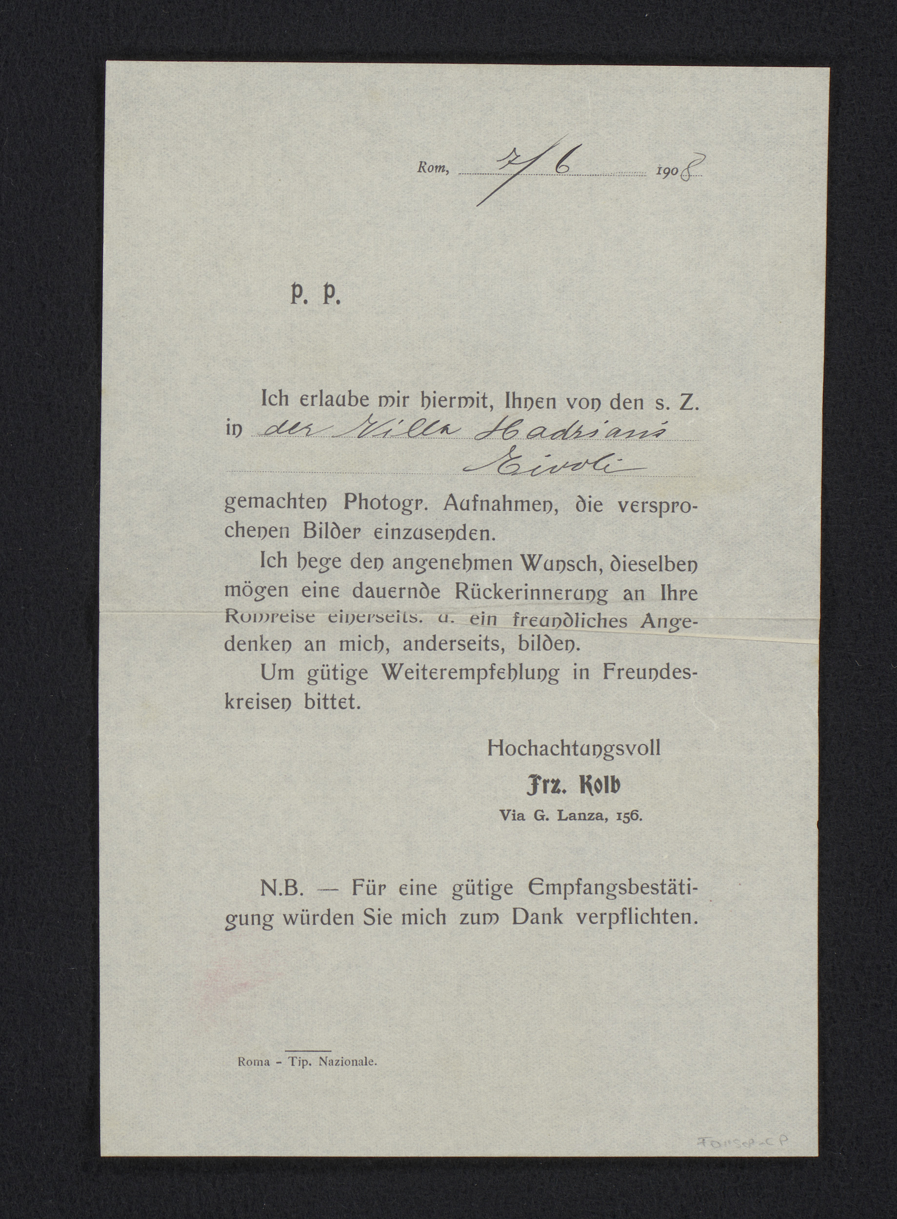 Brief van Franz Kolb met een beschrijving voor een b...