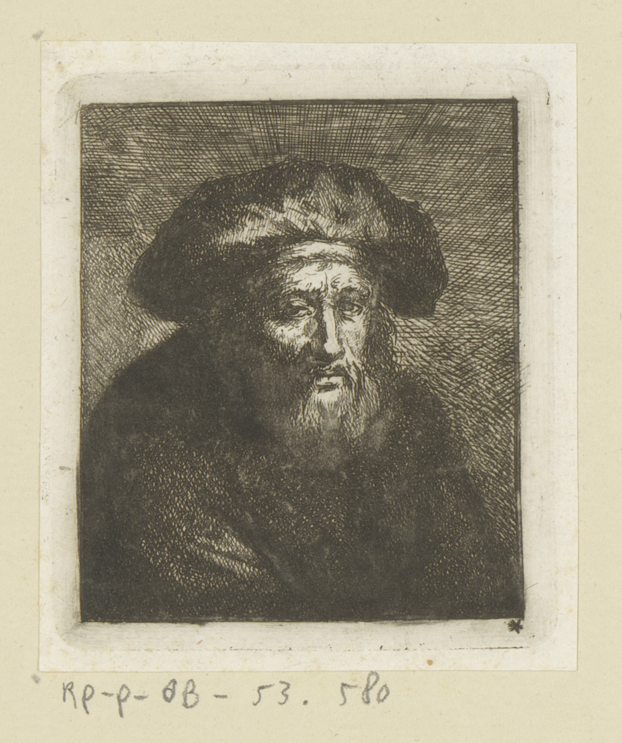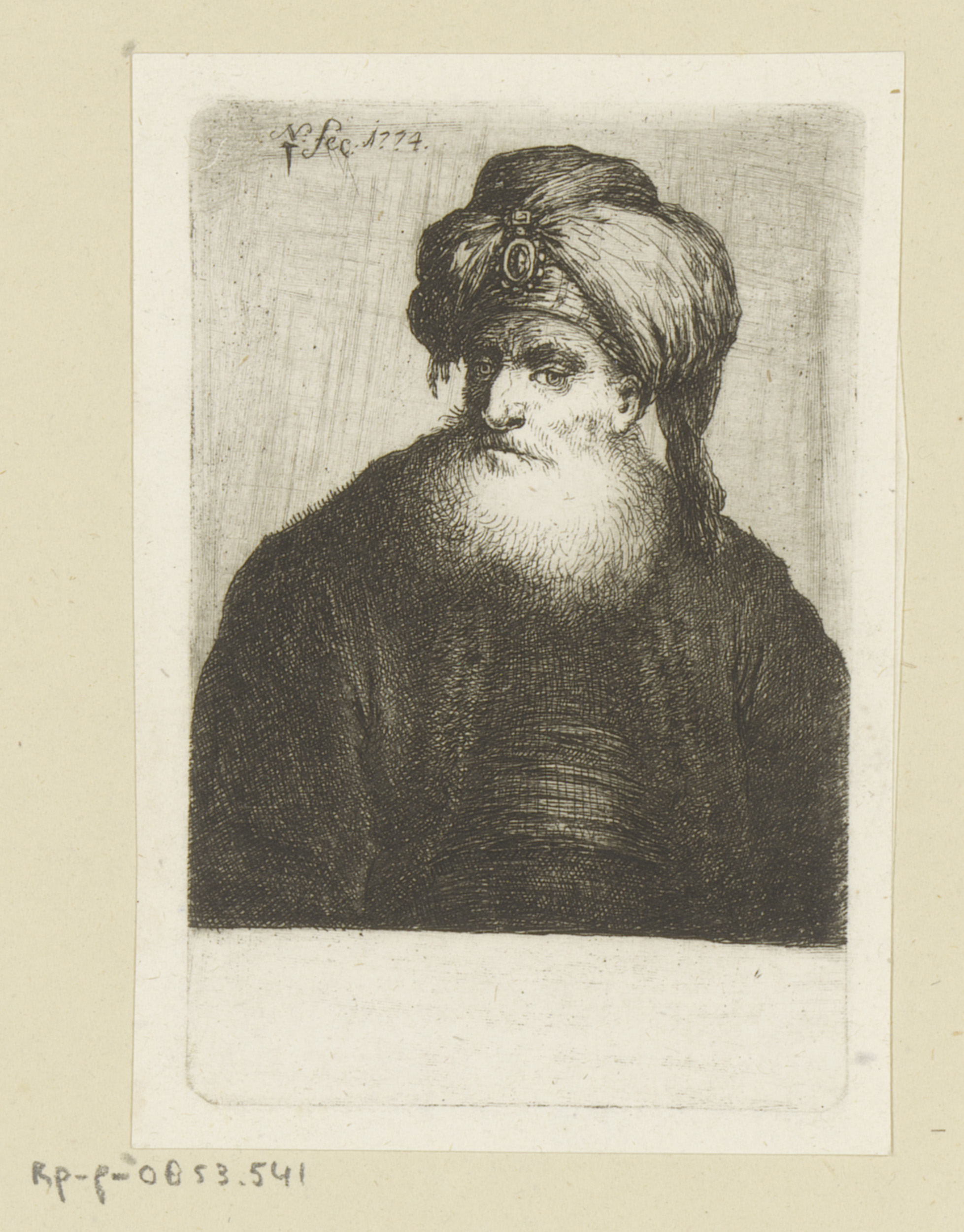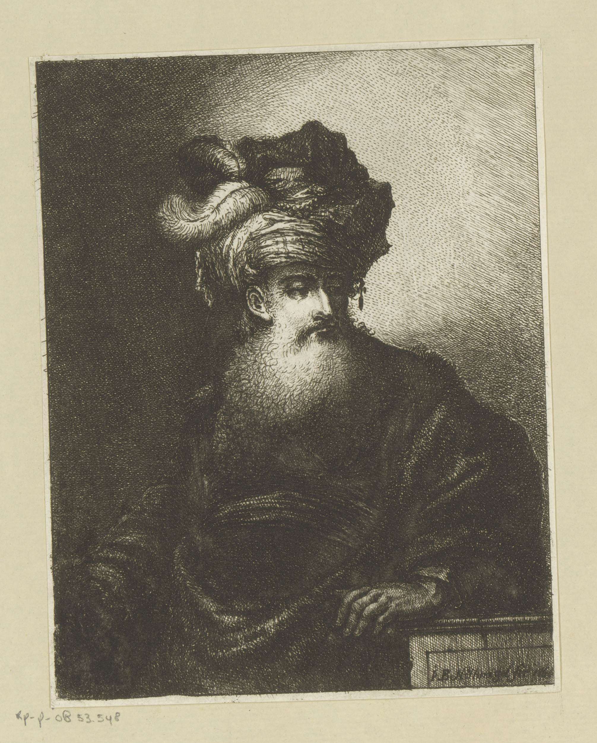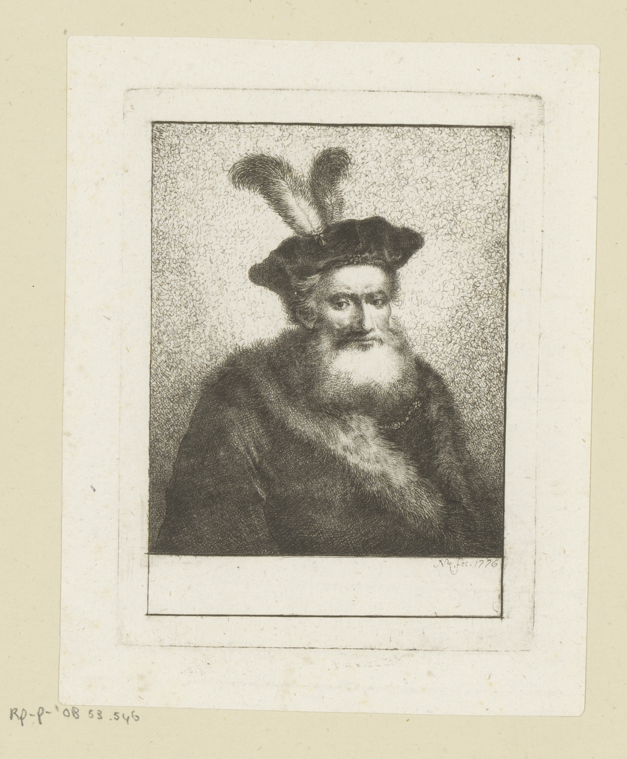Oude man met baard, baret met twee veren en bontmantel
