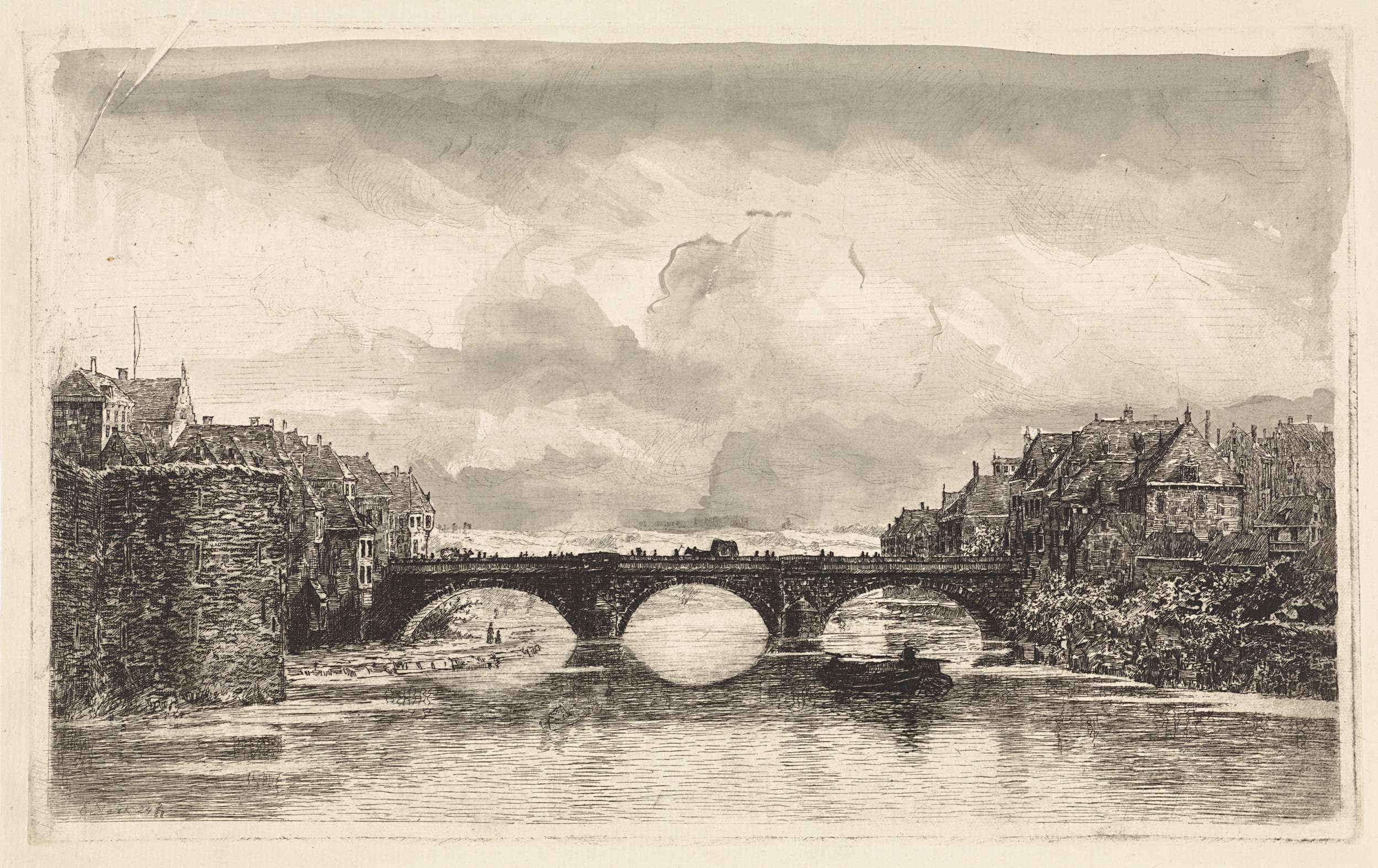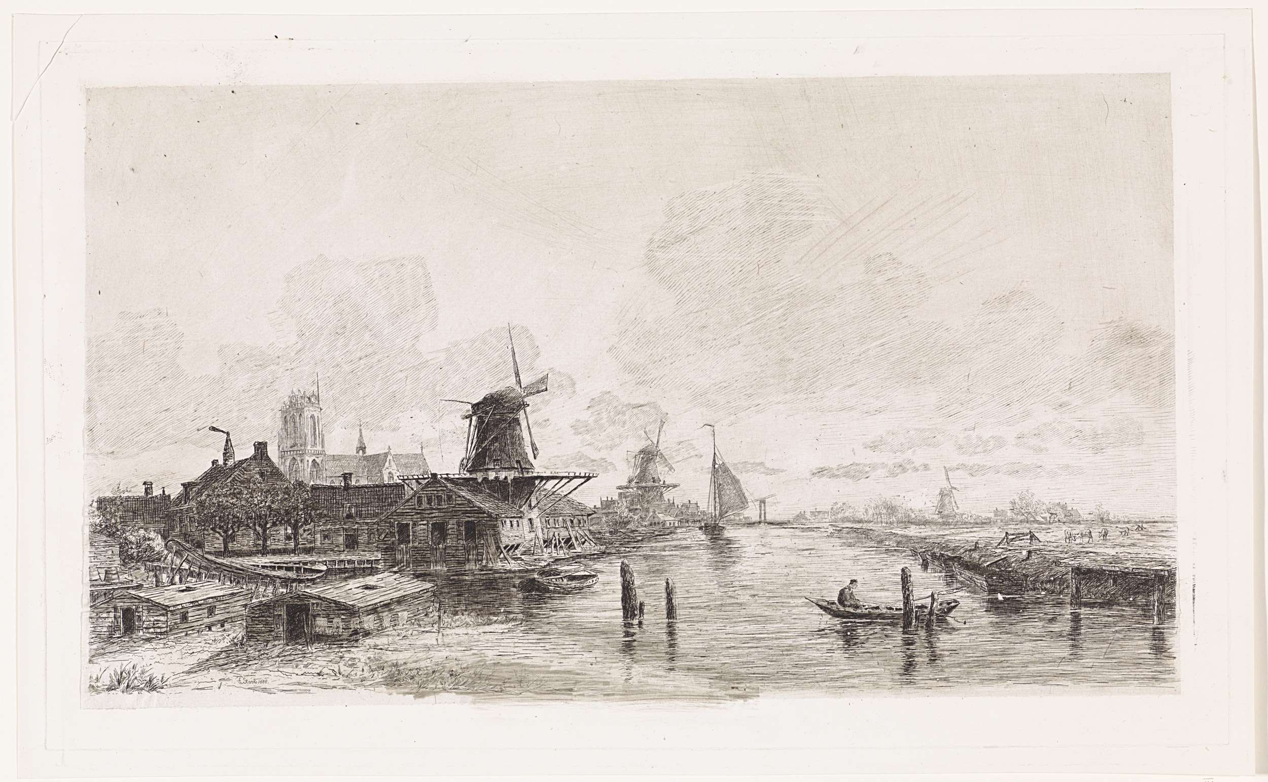 Rivierlandschap met dorp en houtzaagmolen