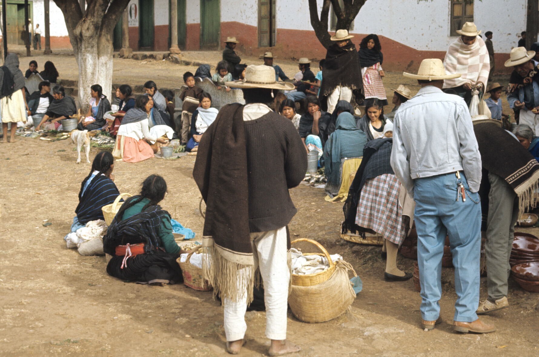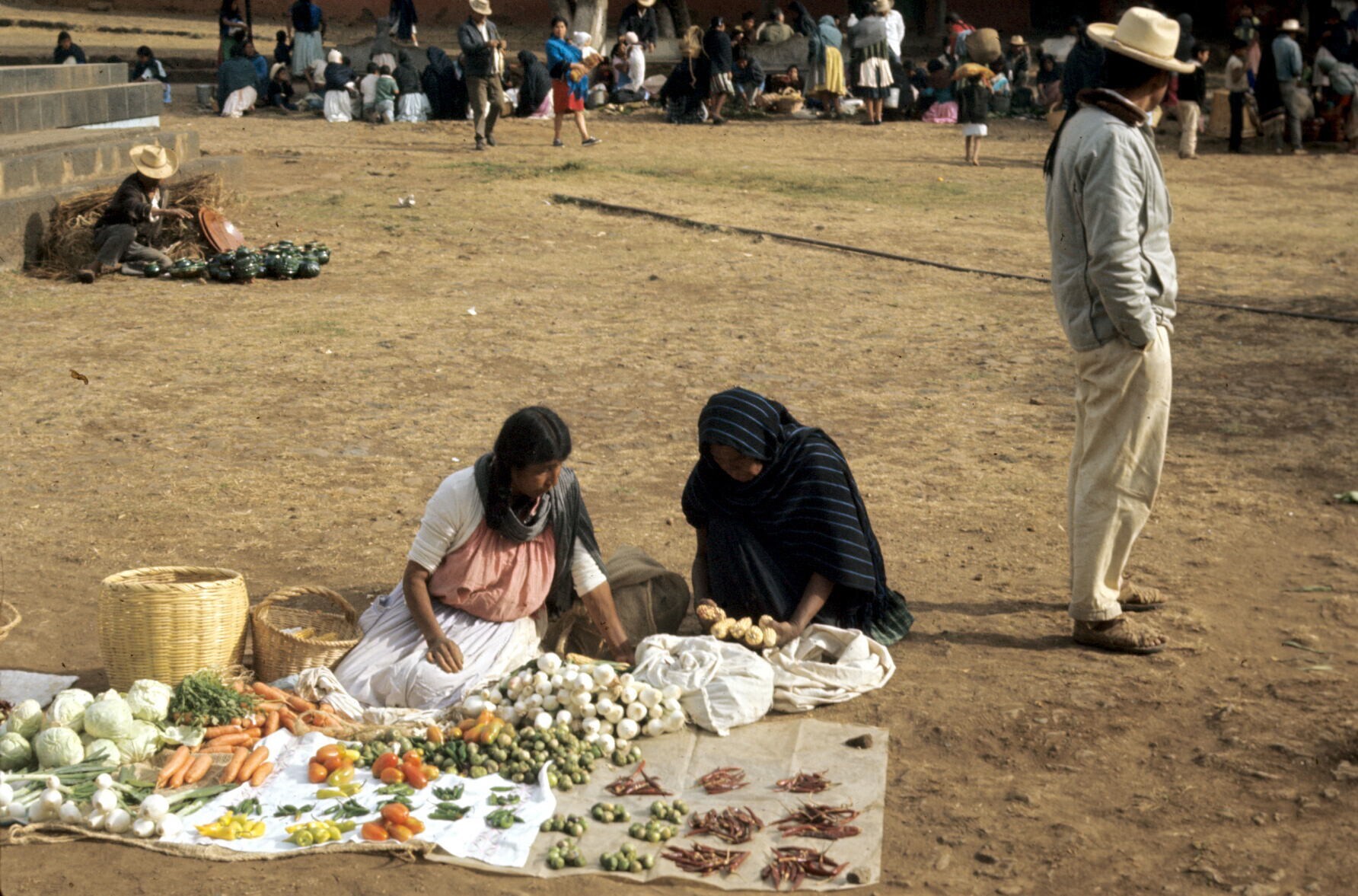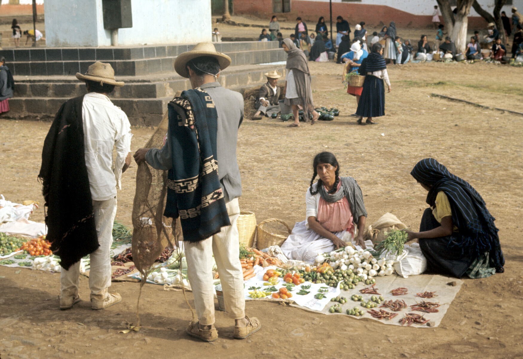mannen in jorongo (poncho) op groenten- en fruitmarkt