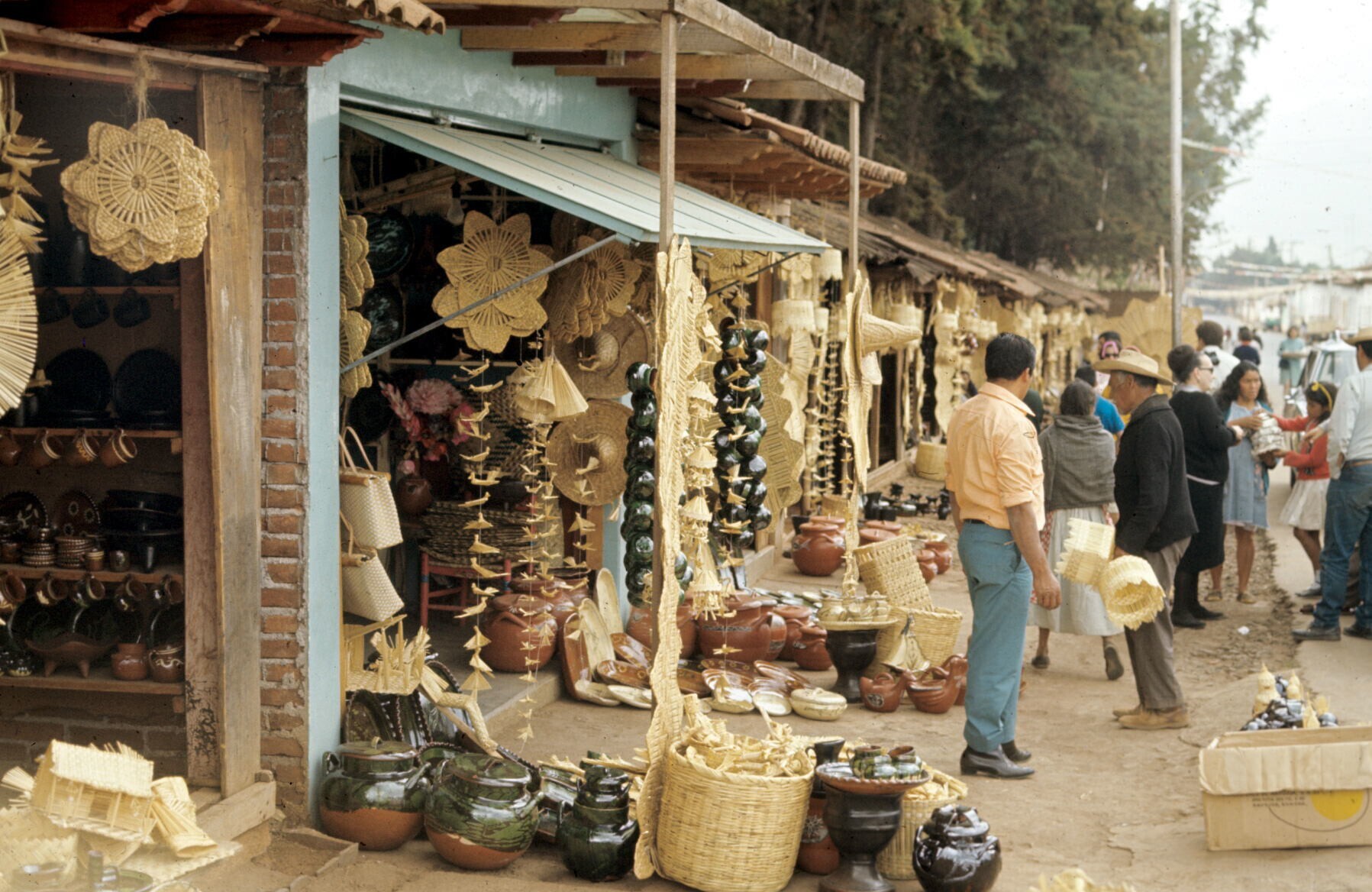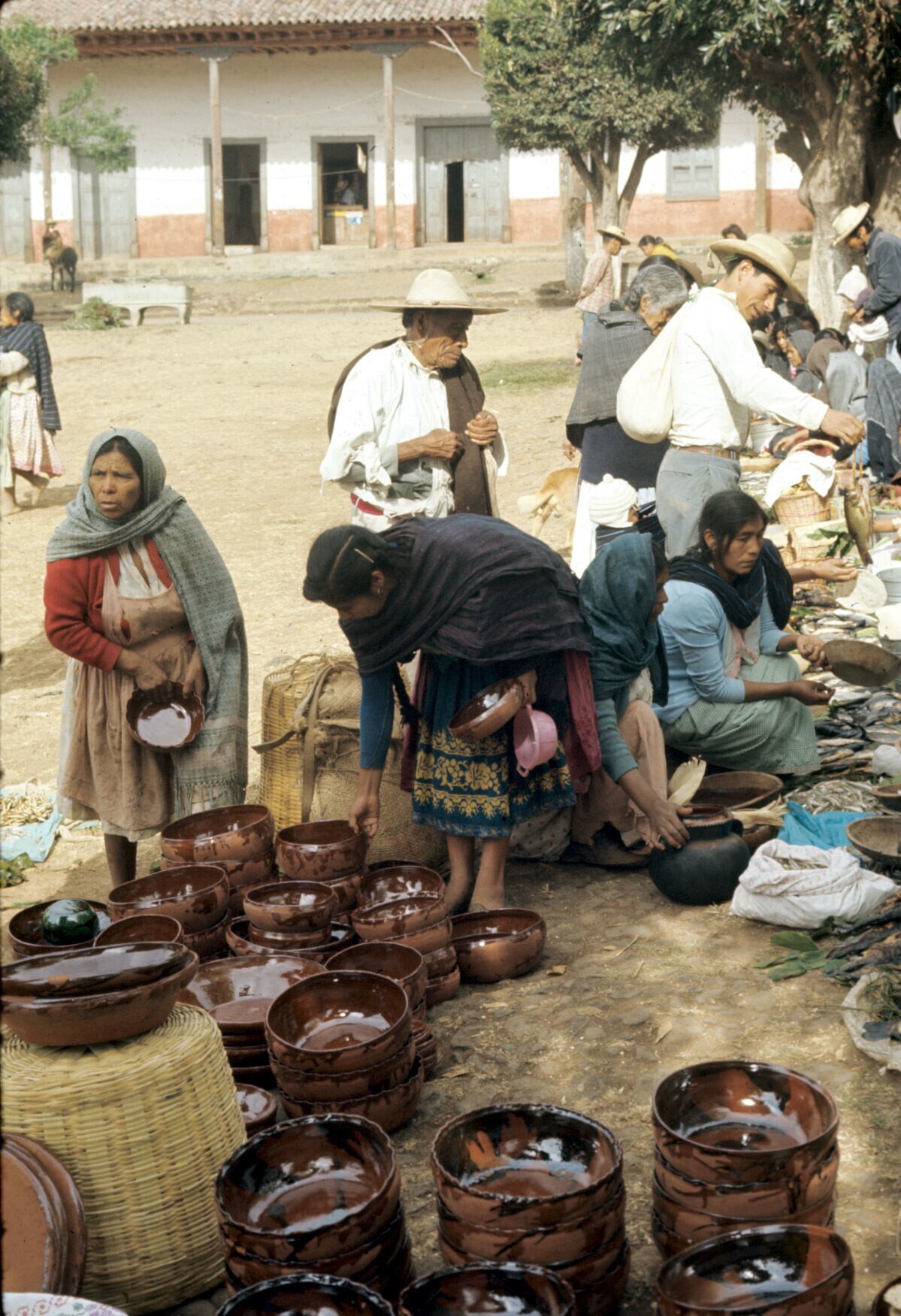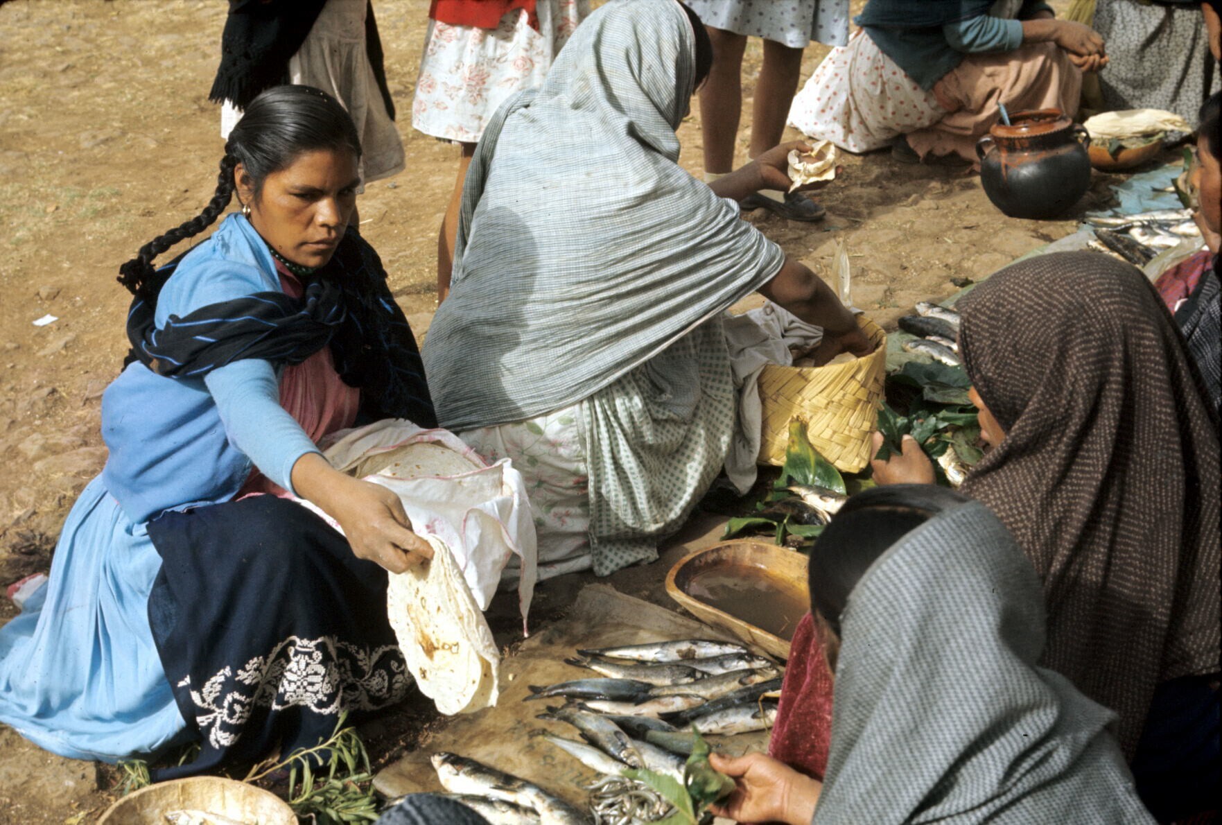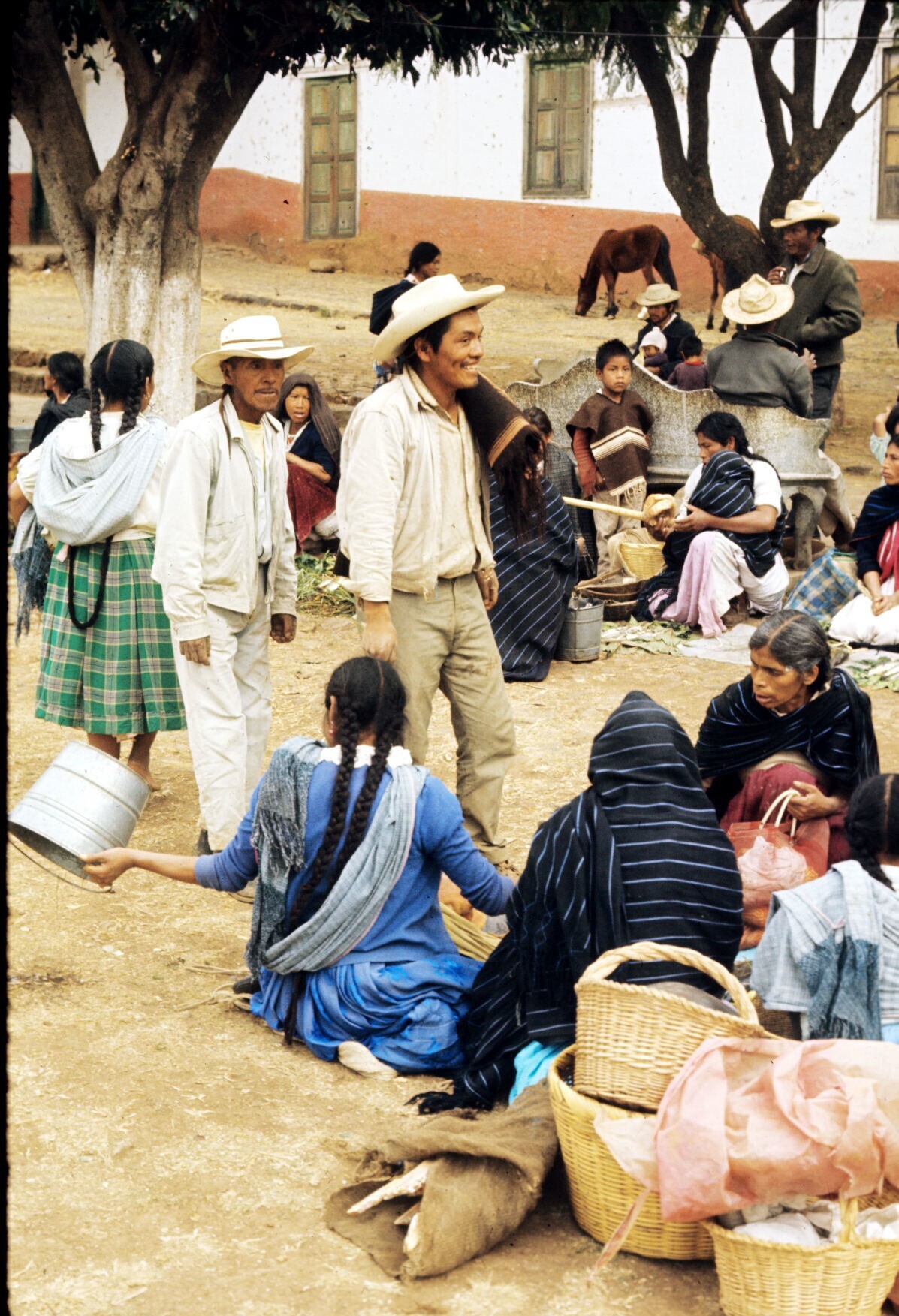 mannen in jorongo (poncho) op groenten- en fruitmarkt