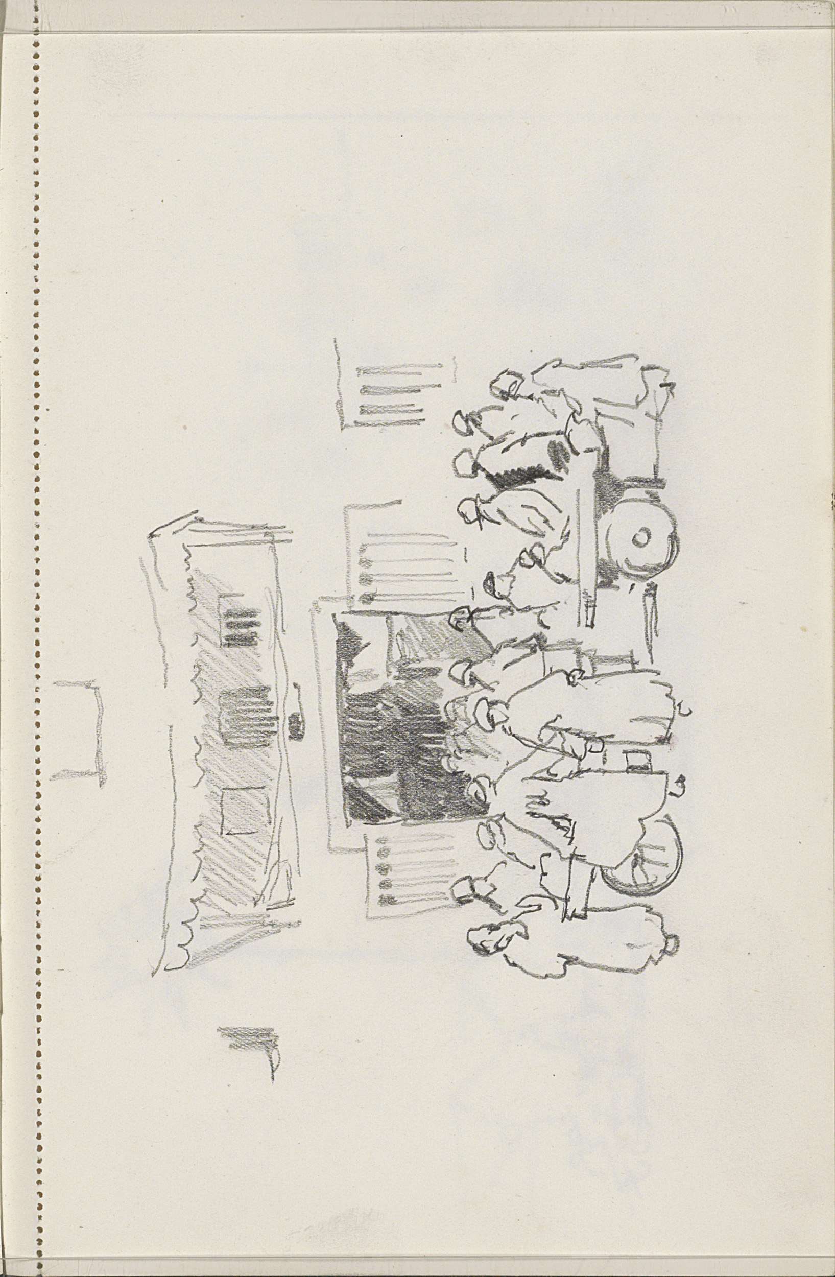 Groep figuren in oosters kostuum bij een deuropening