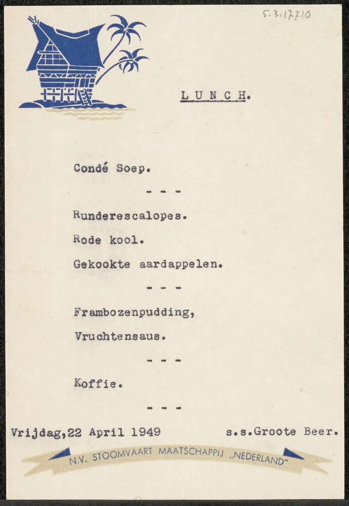 Kaart met menu lunch aan boord van s.s. Groote Beer,...
