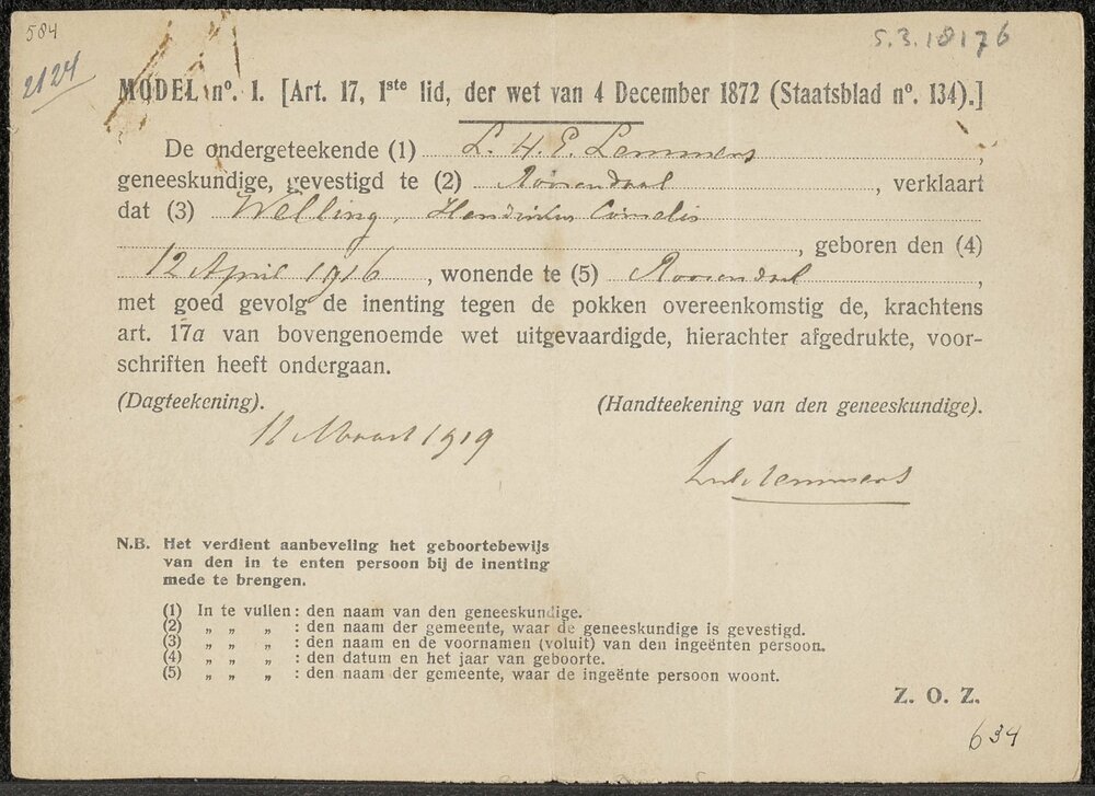 Verklaring dat H.C. Welling op 12 april 1916 ingeënt...