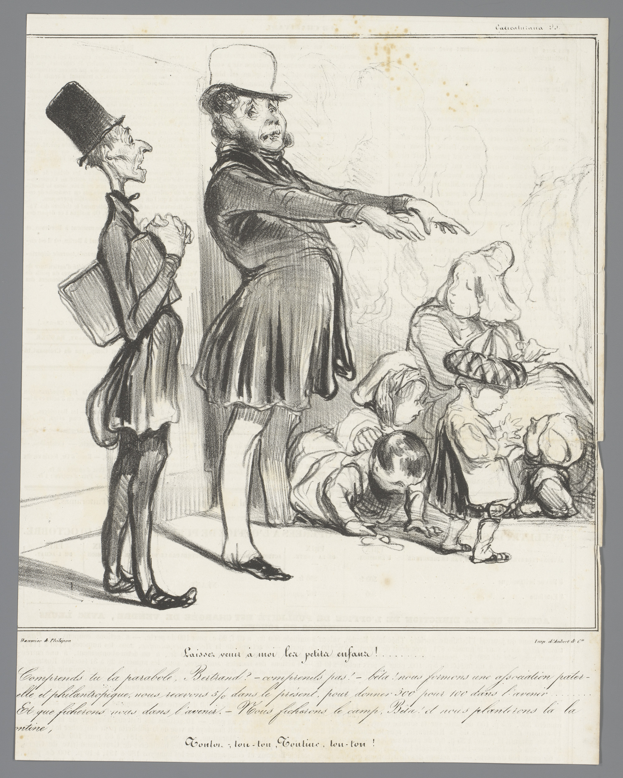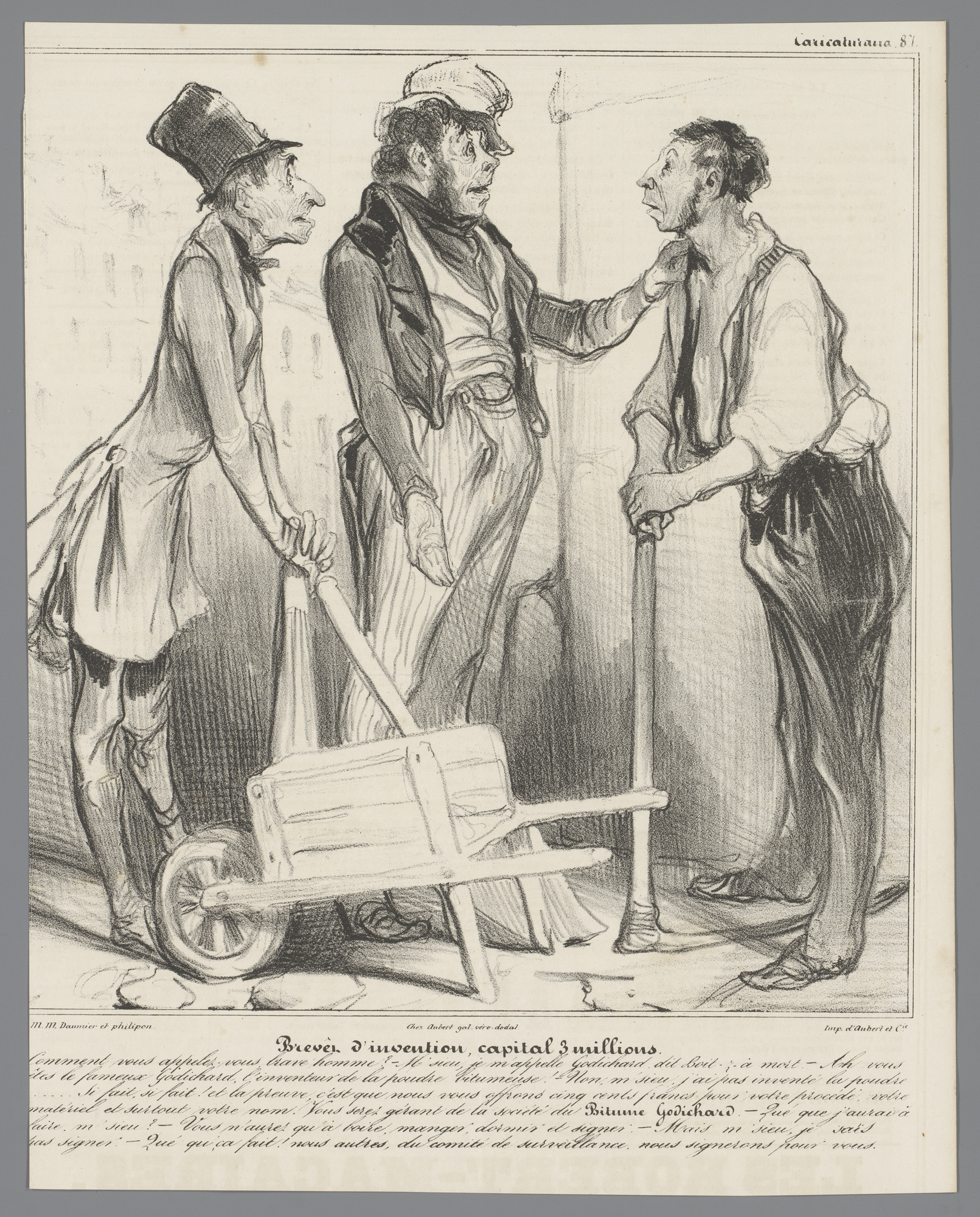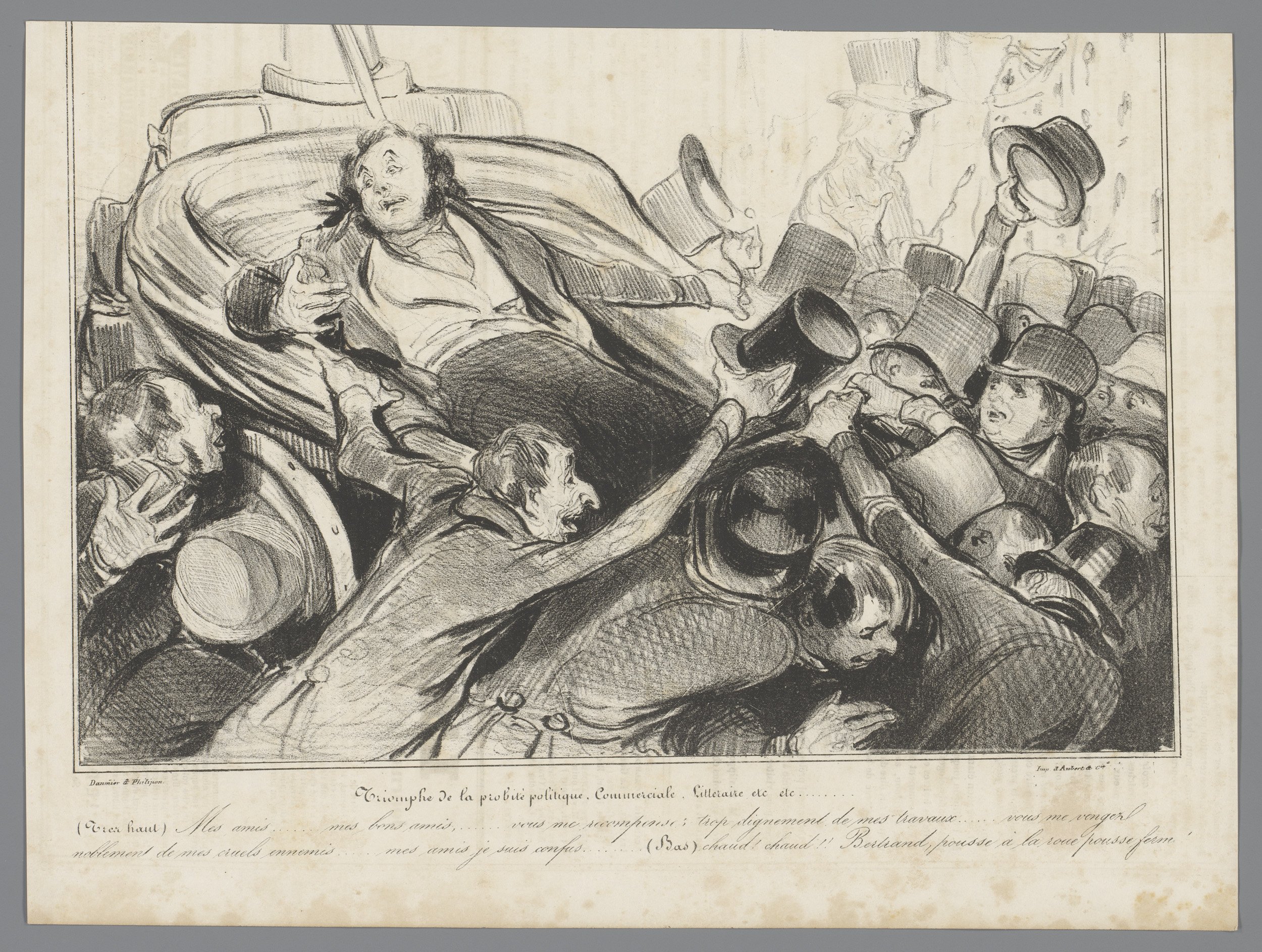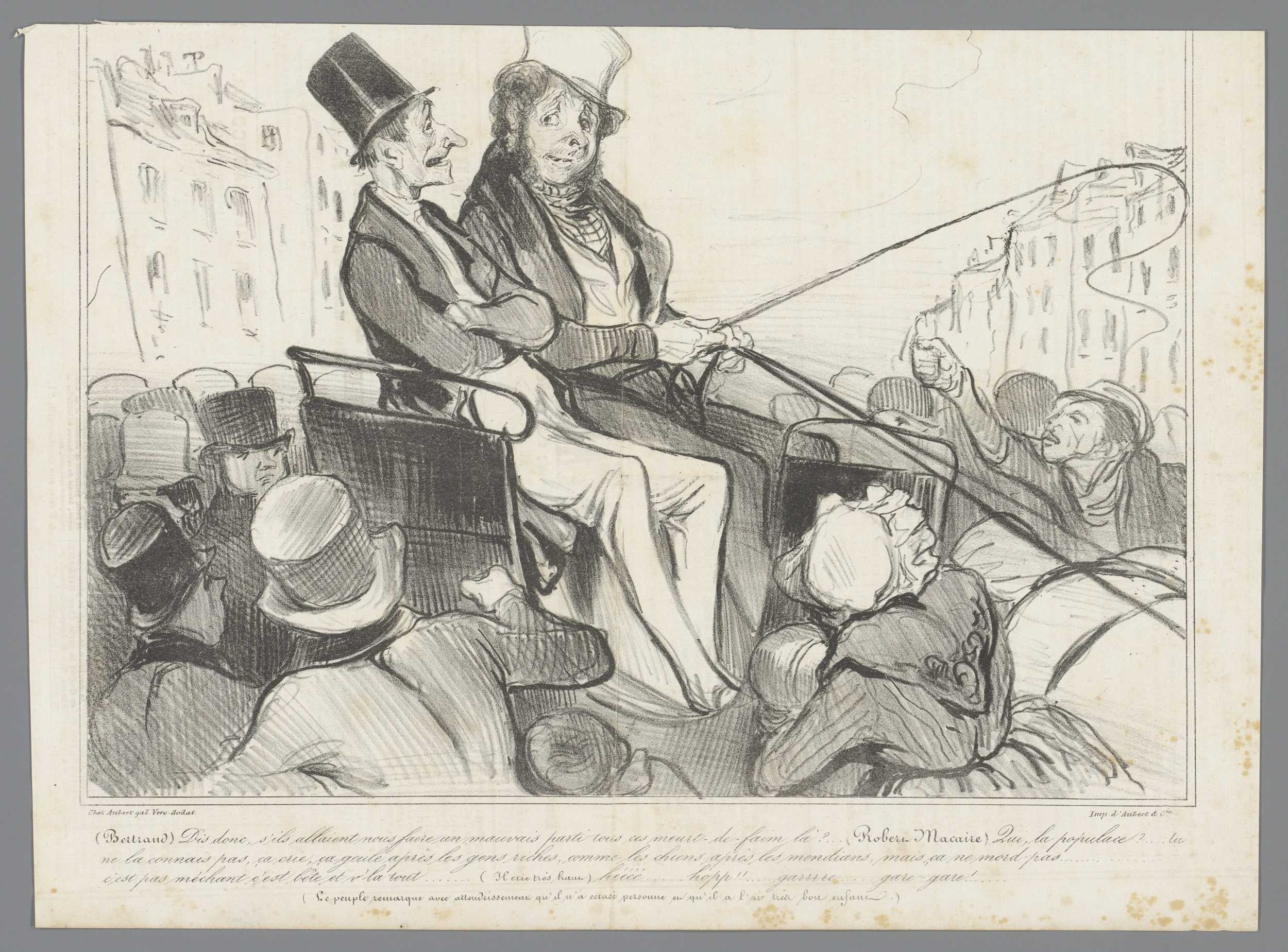 Groep mensen duwt het rijtuig van Robert-Macaire voort