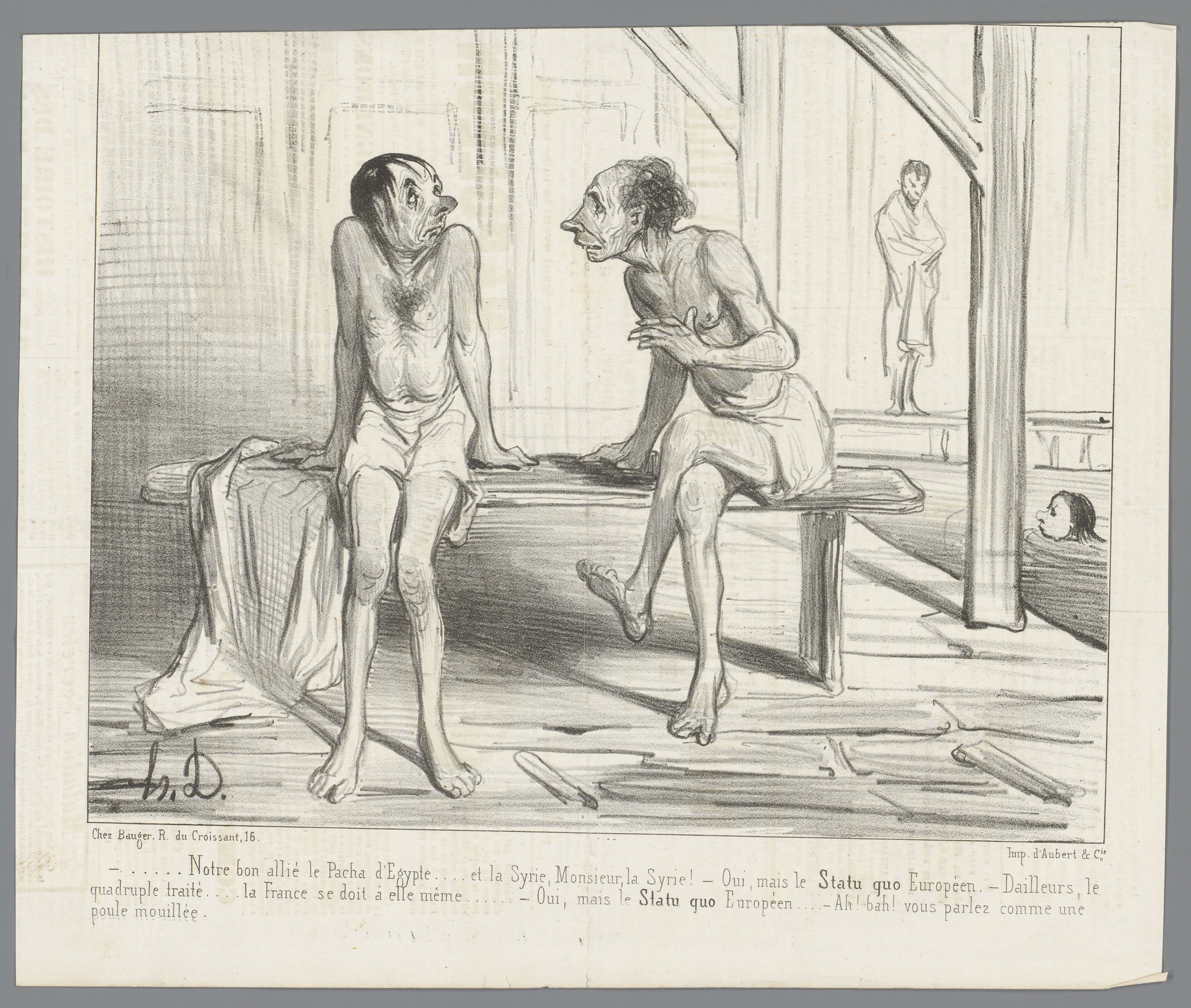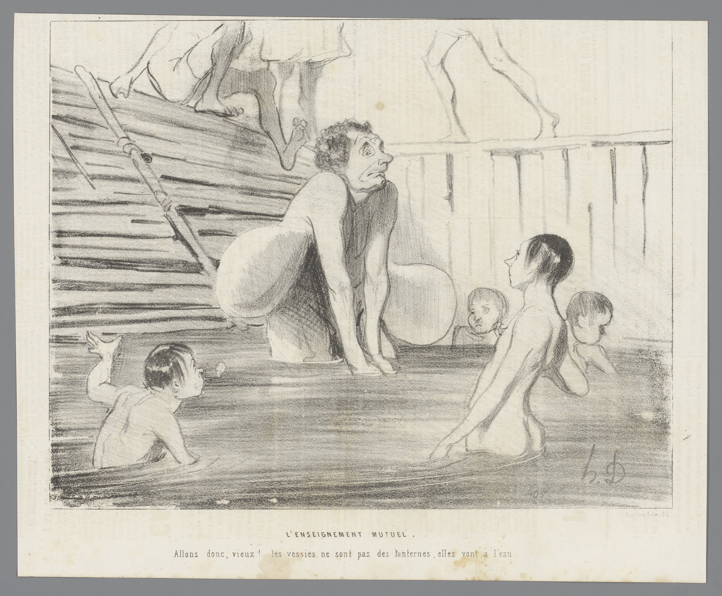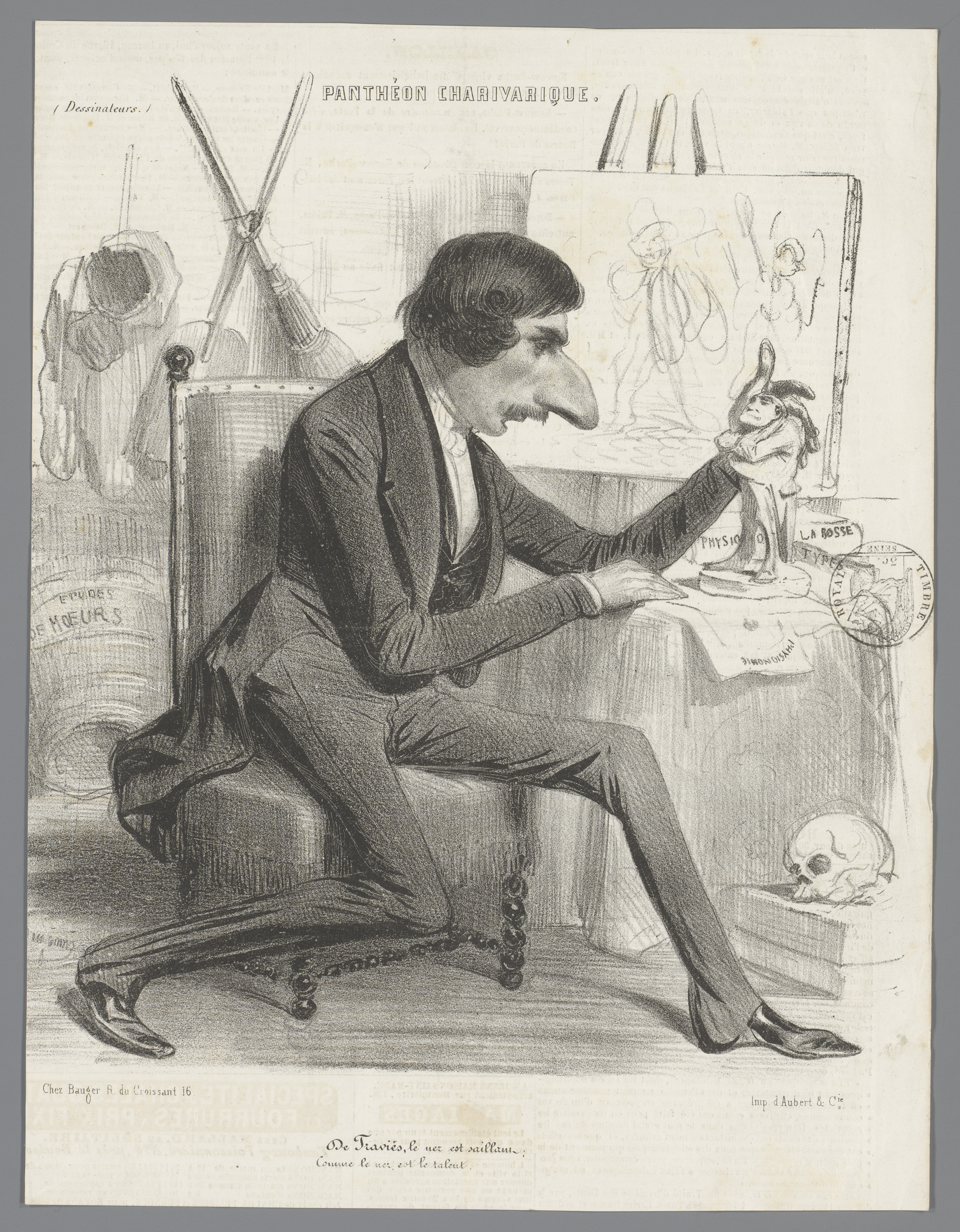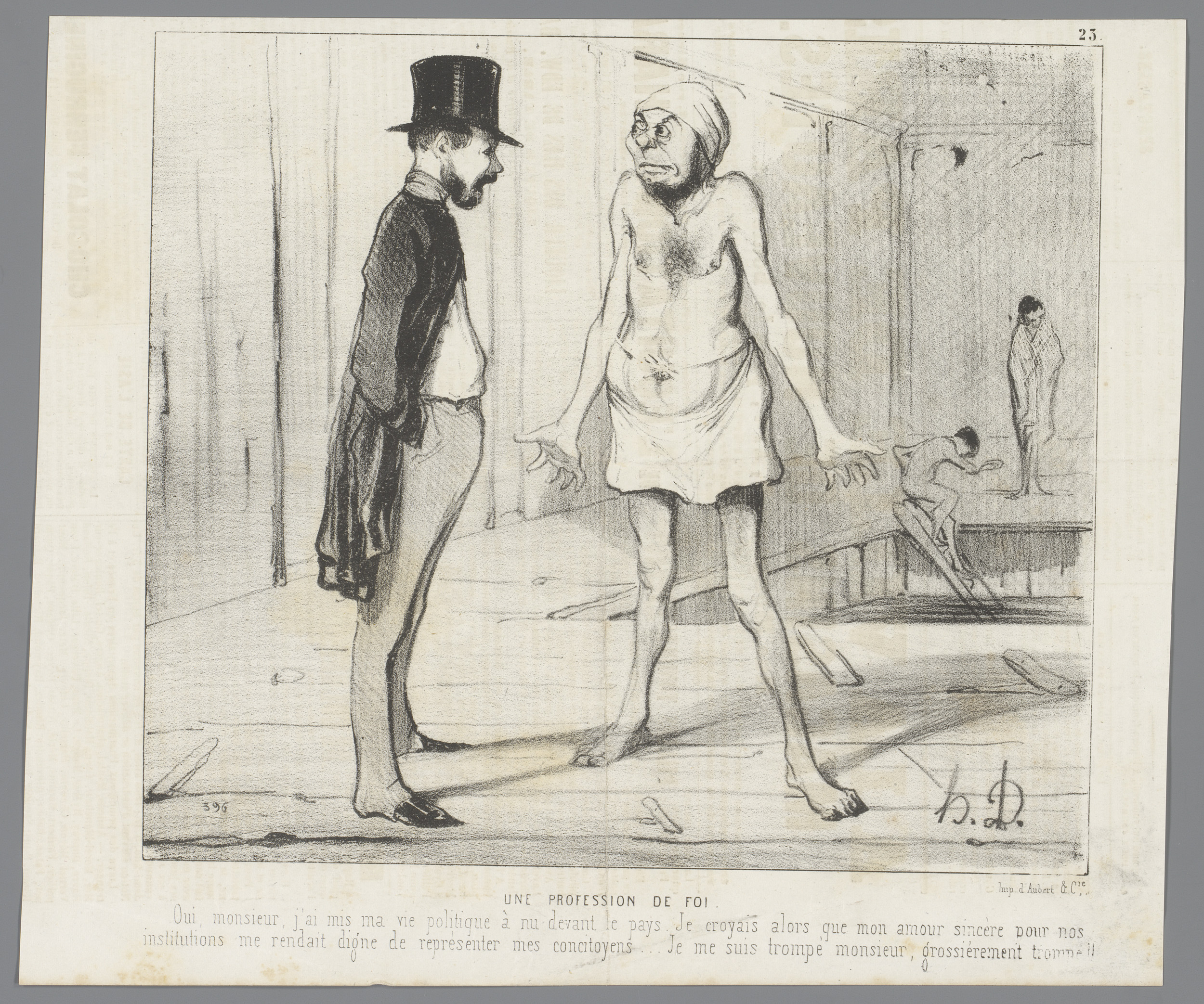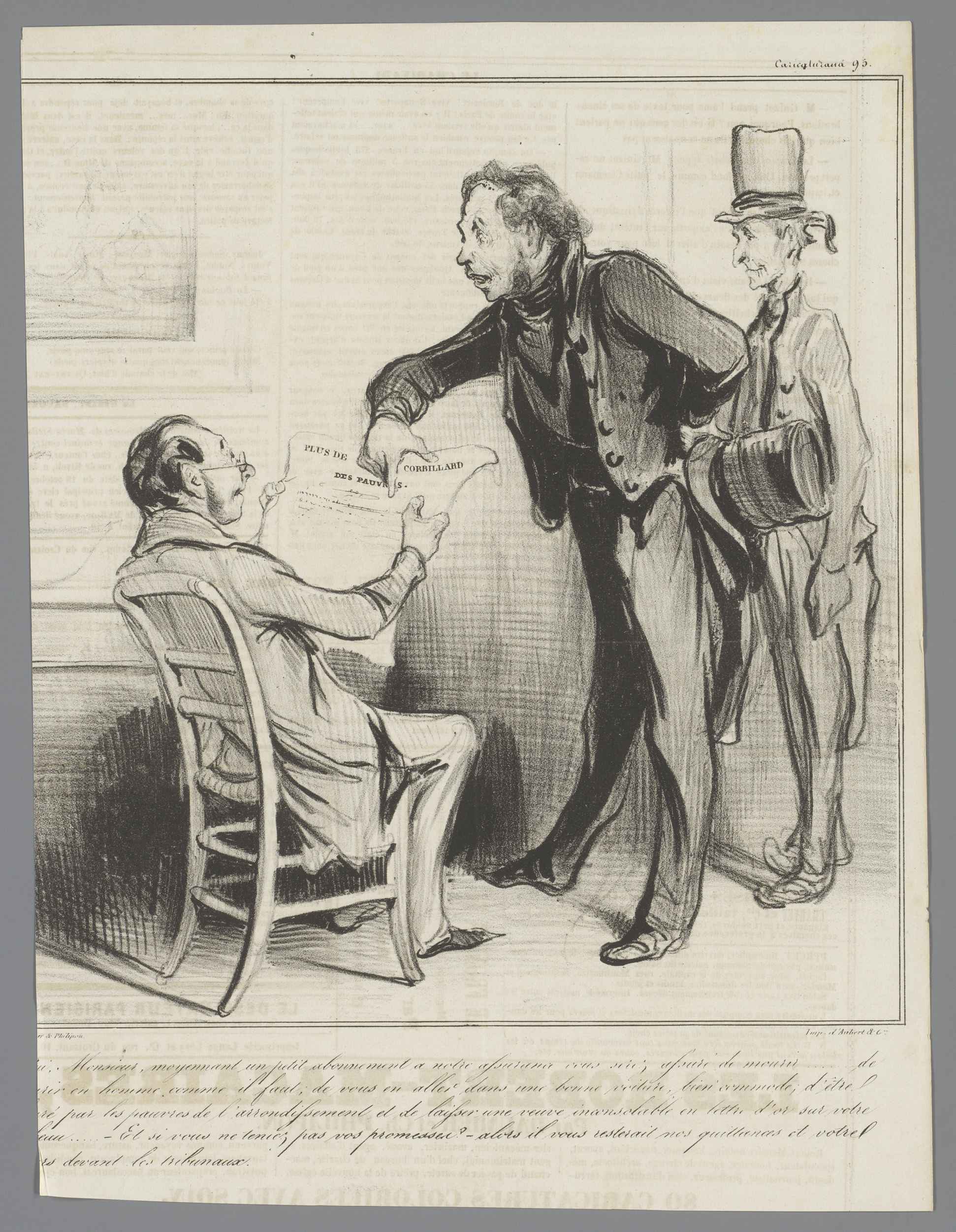 Groep mensen duwt het rijtuig van Robert-Macaire voort