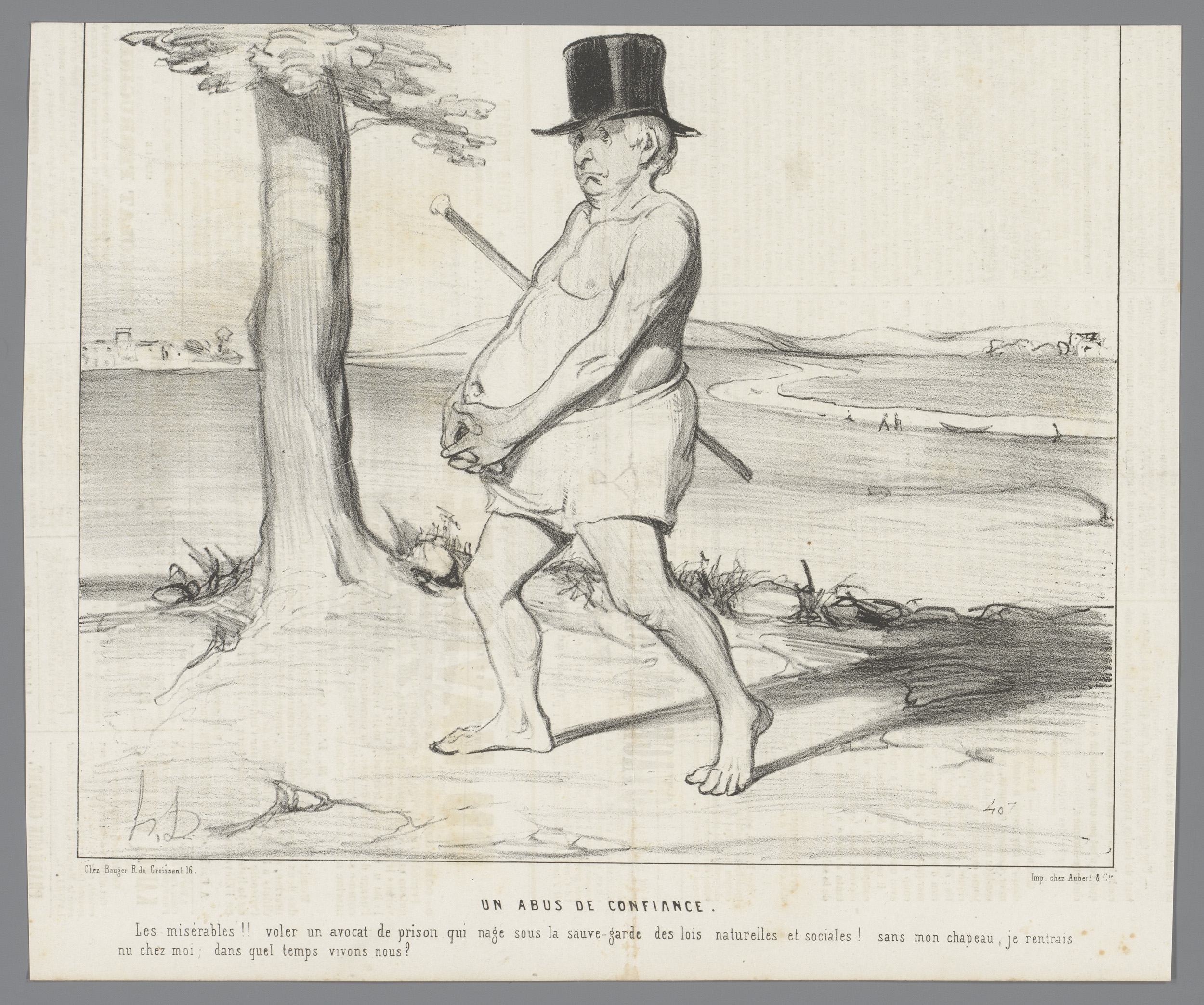 Man in zwembroek met hoge hoed en wandelstok onder z...