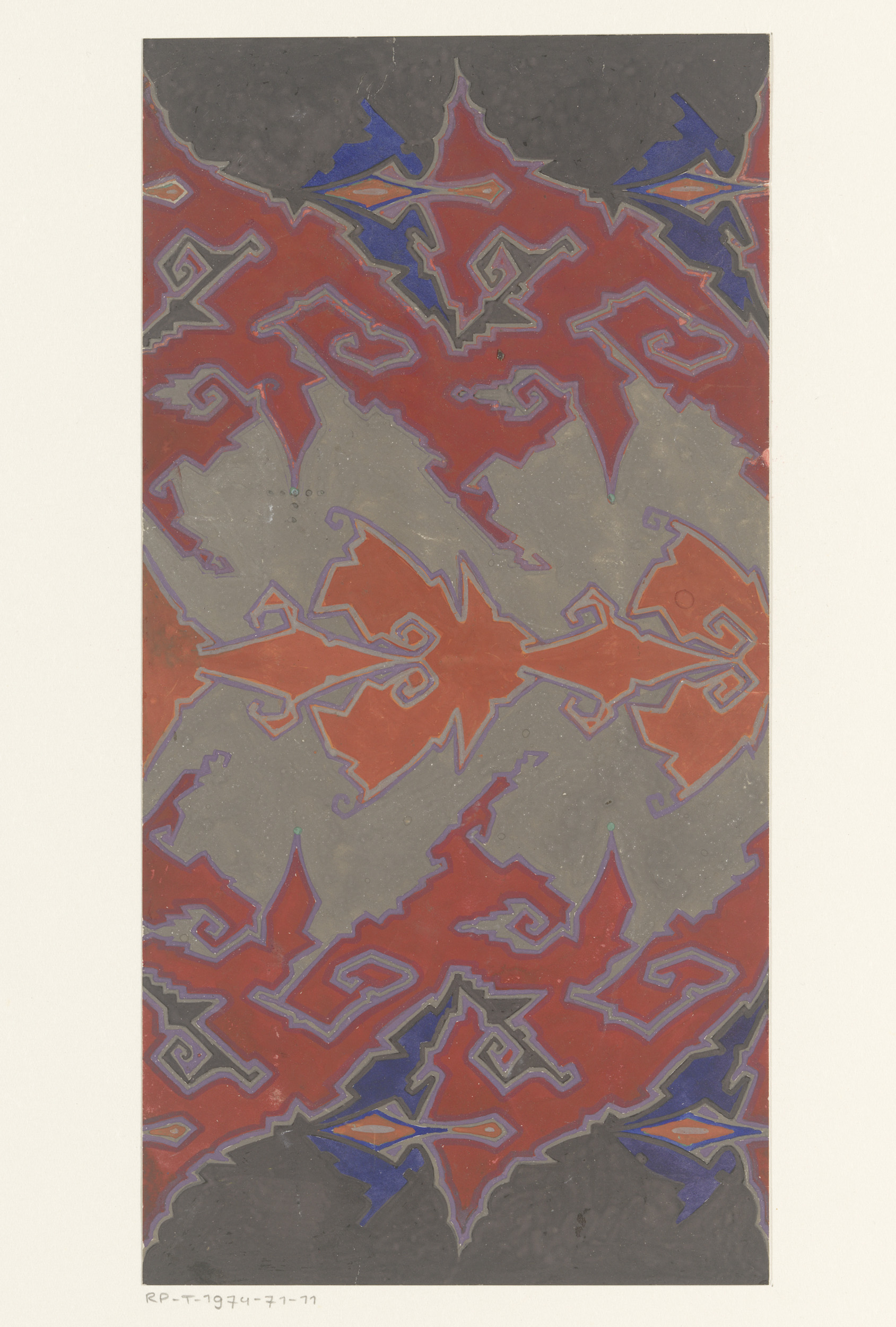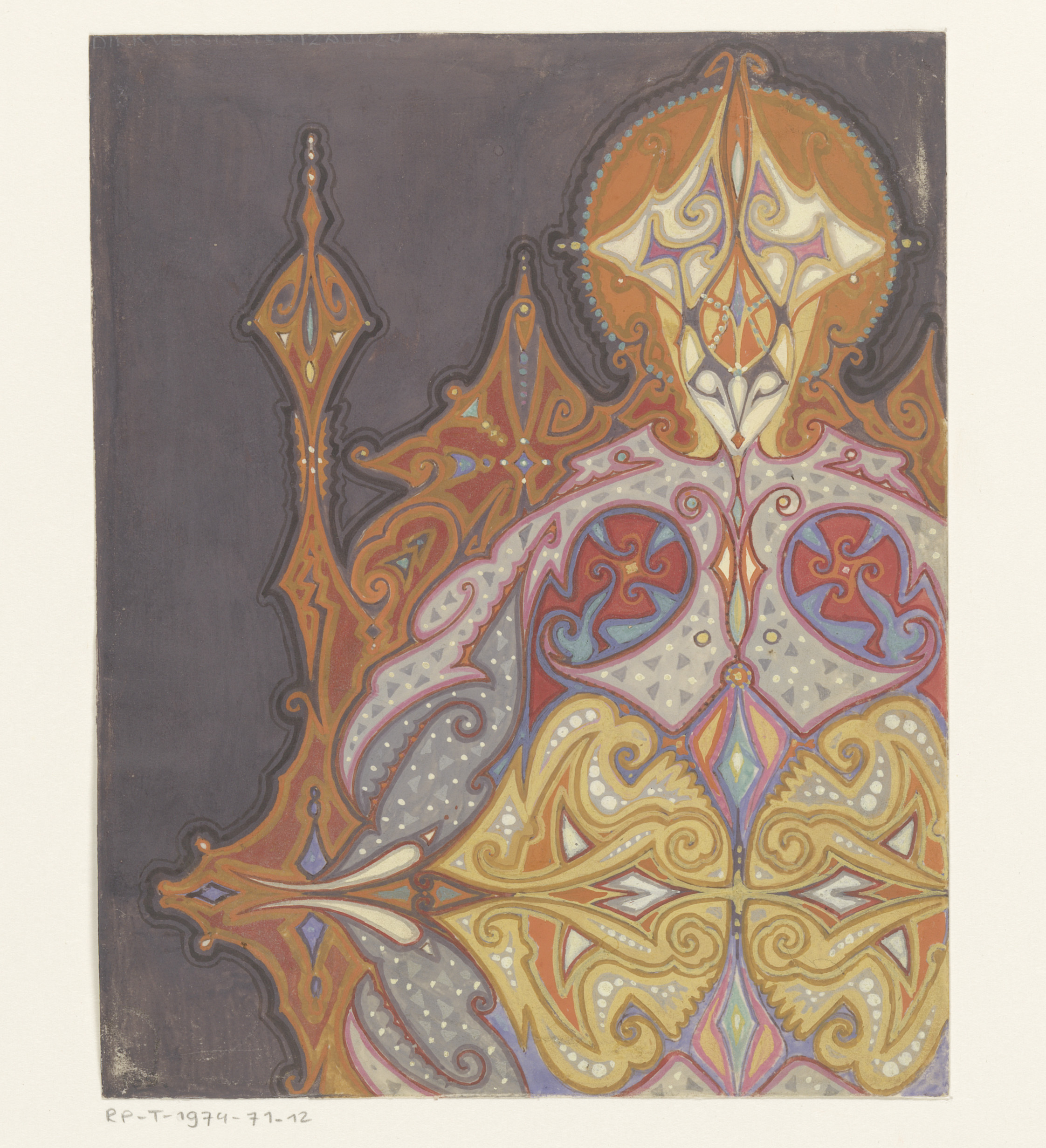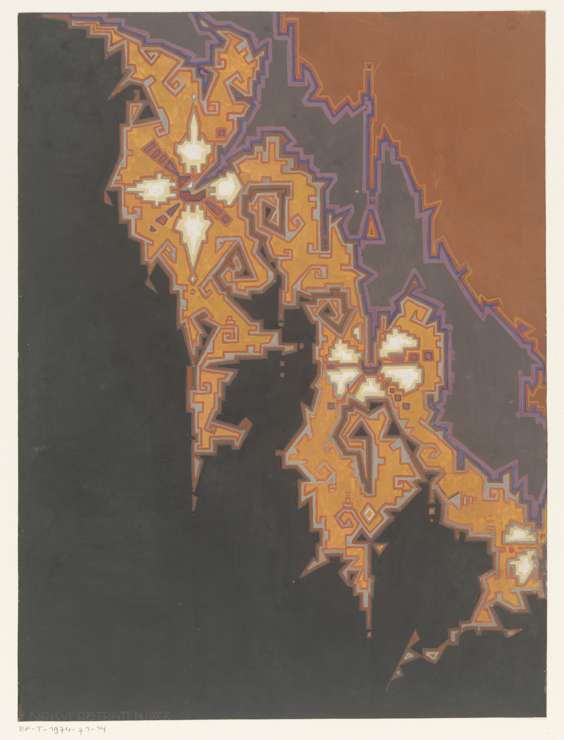 Ontwerp voor een tapijt met spitse en krullende vormen
