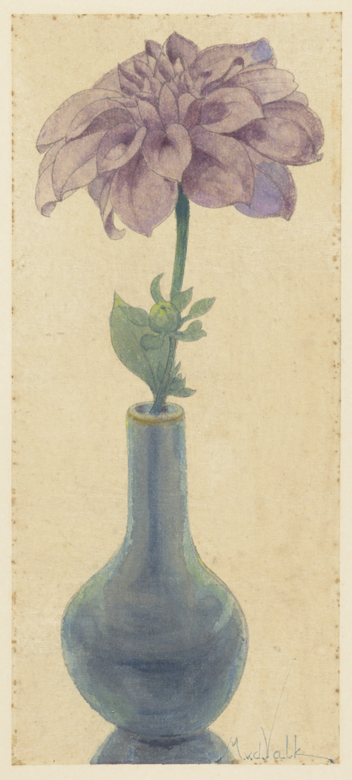 Blauw glazen vaasje met lila Dahlia