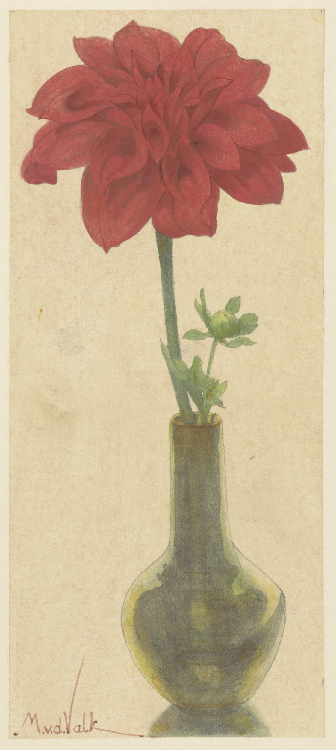 Glazen vaasje met rode Dahlia
