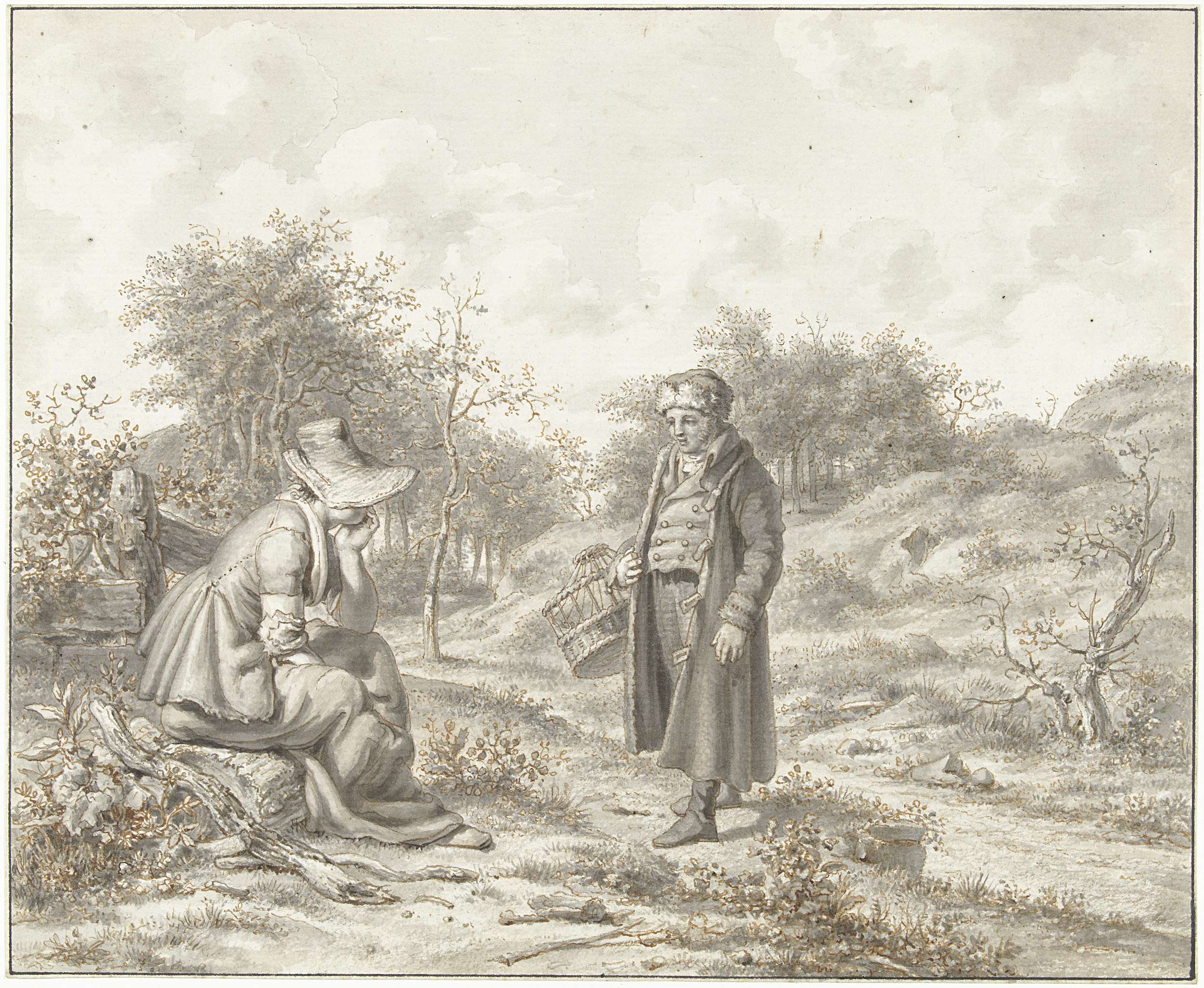 Heuvelig landschap met zittende vrouw en staande man...