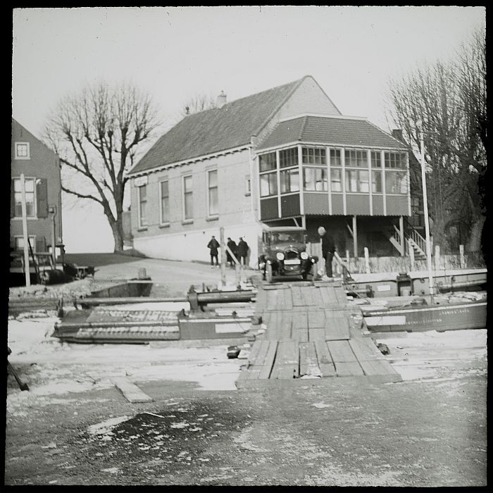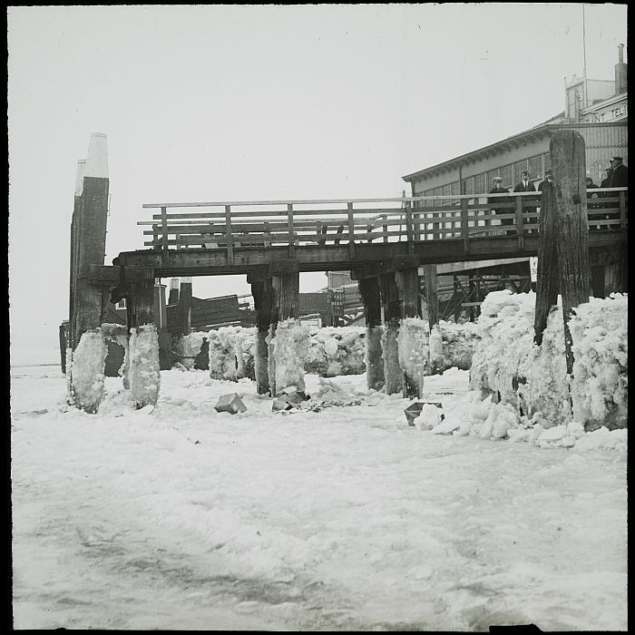 Glasdia, ijsgang rond een aanlegsteiger in de Maas, ...