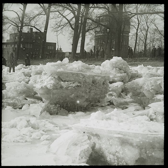 Glasdia, wandelaars in het kruiende ijs te Kralingen