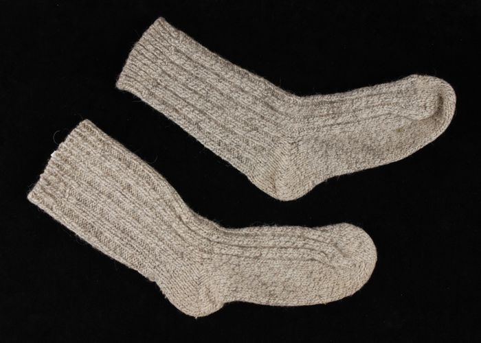 Paar gebreide geitenwollen sokken met elastiek in de...