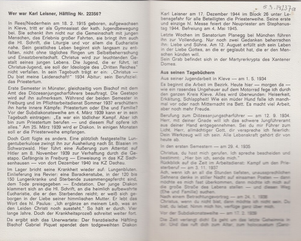 bidprentje Karl Leisner, Häftling Nr. 22356
