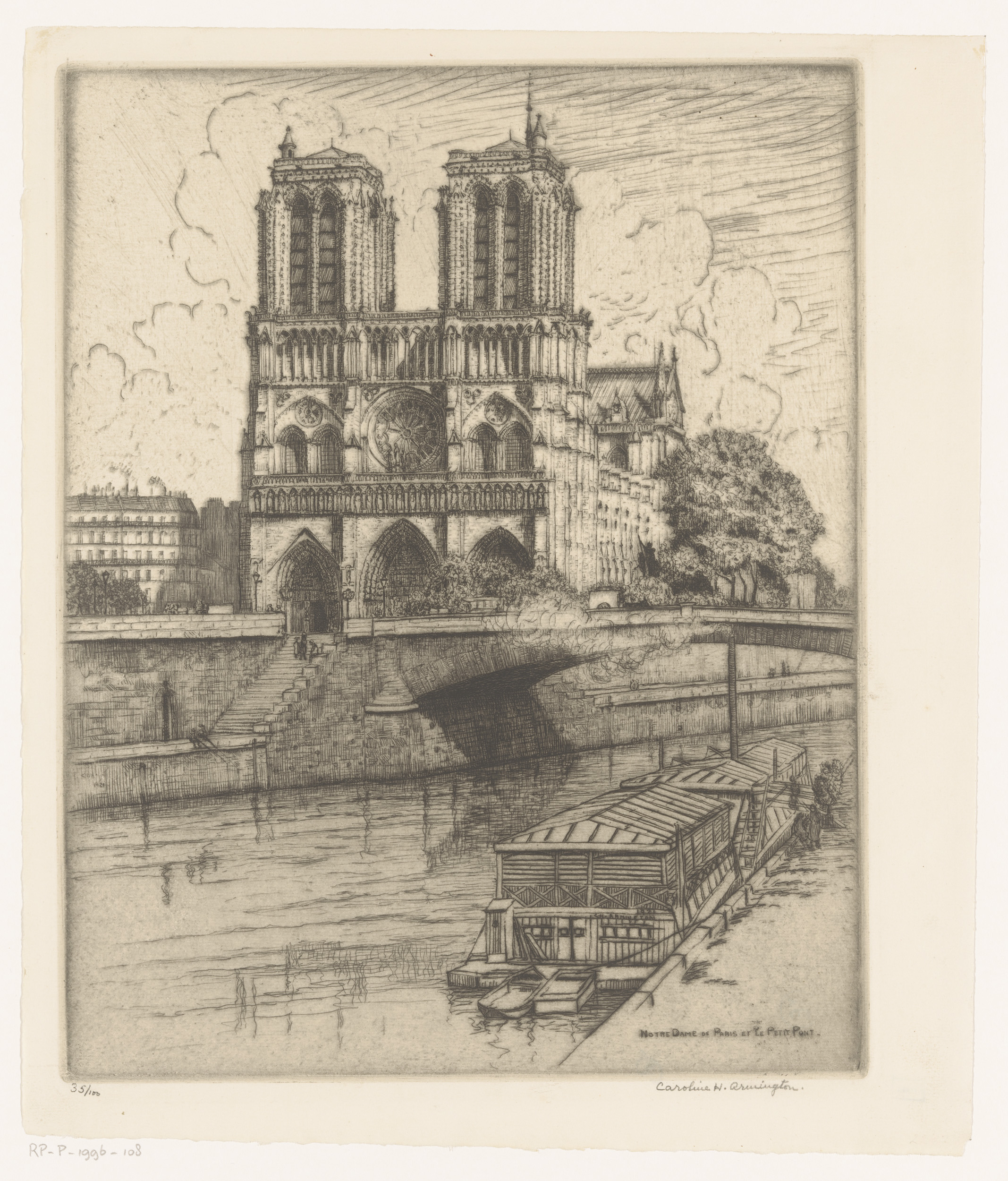 Gezicht op de Notre Dame en de Petit-Pont te Parijs