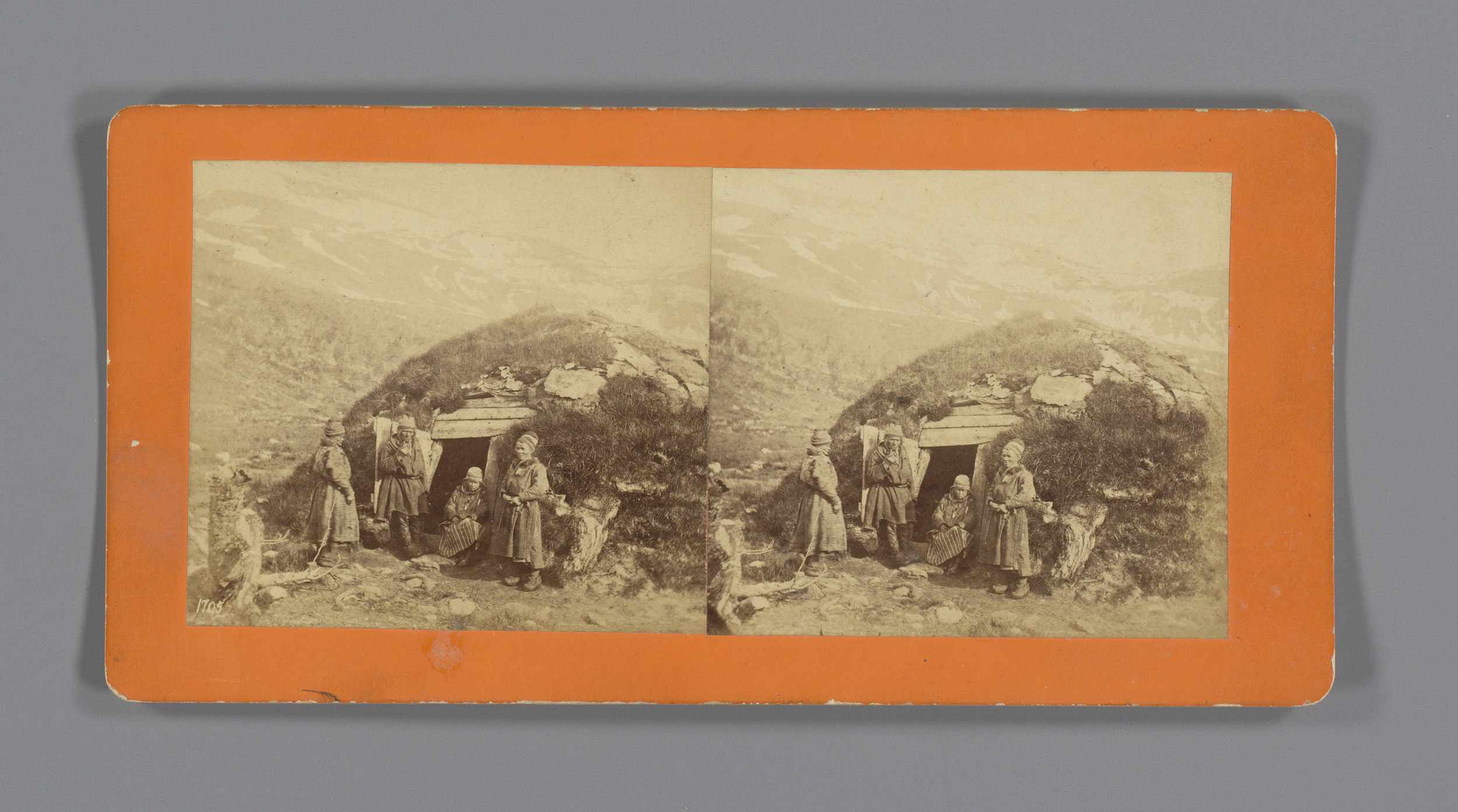 Een familie uit Sápmi (Lapland) voor hun woning (gam...