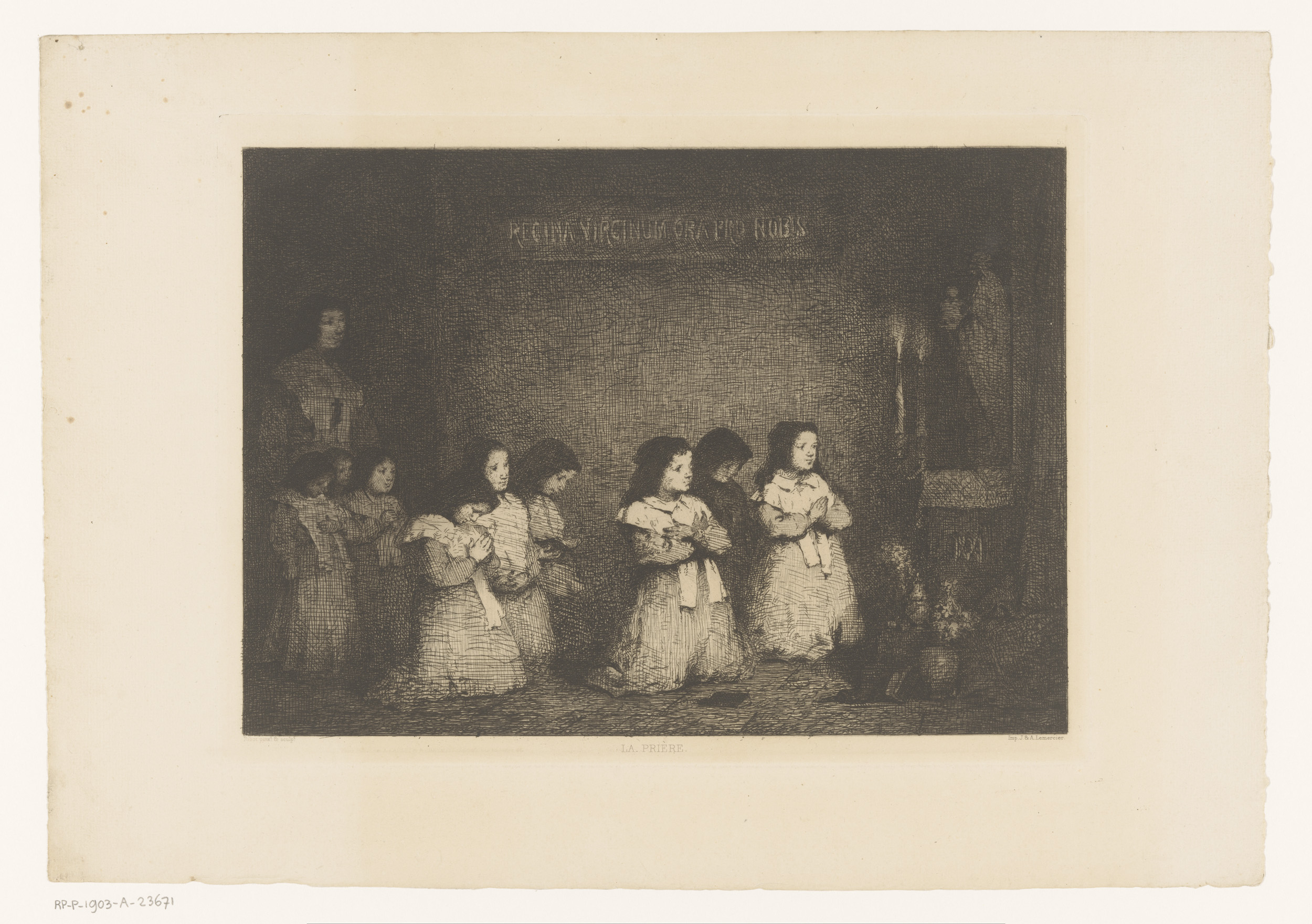 Groep meisjes in gebed voor een Mariabeeld
