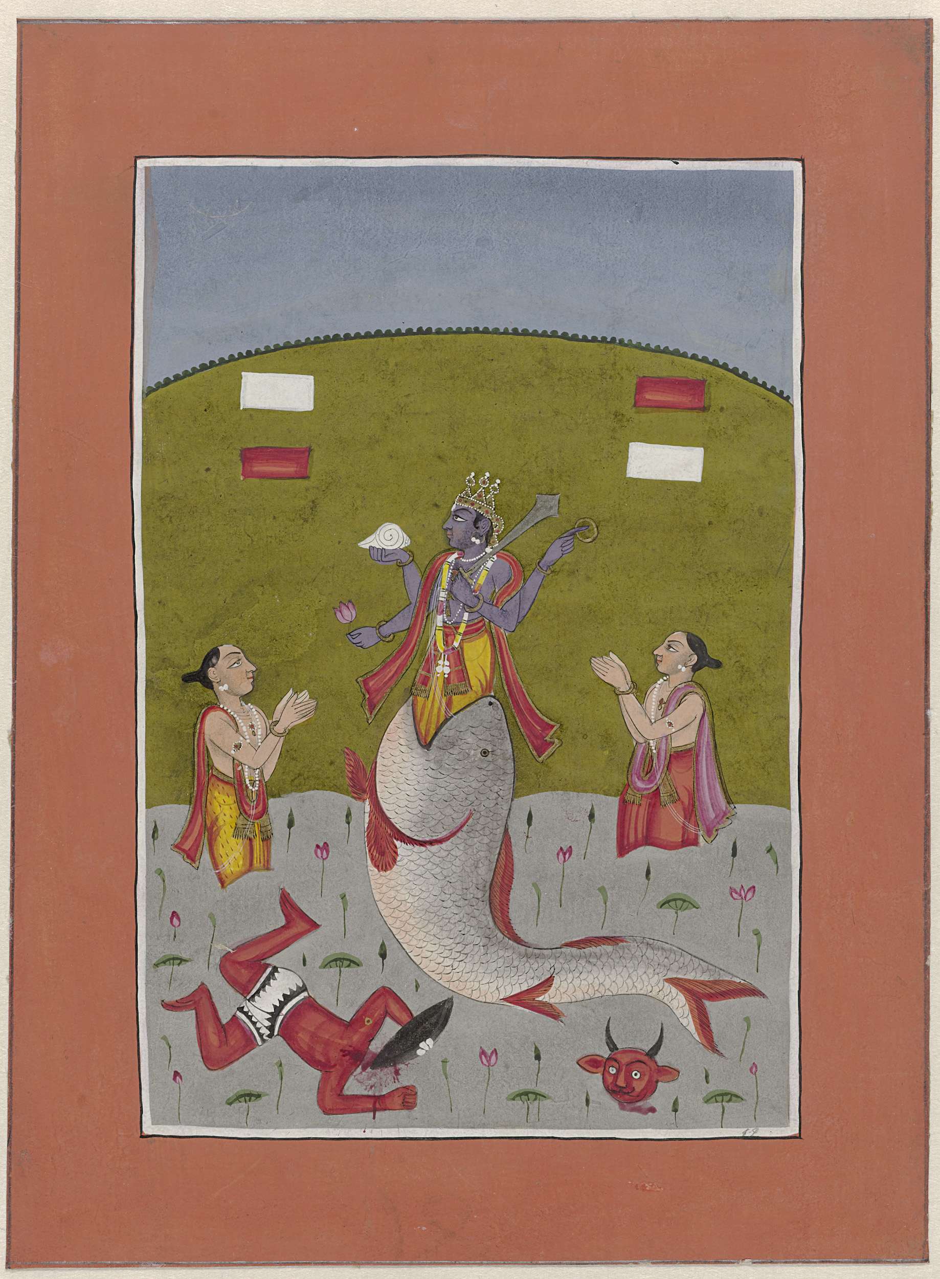 Avatar van Vishnu die verrijst uit de bek van een vis