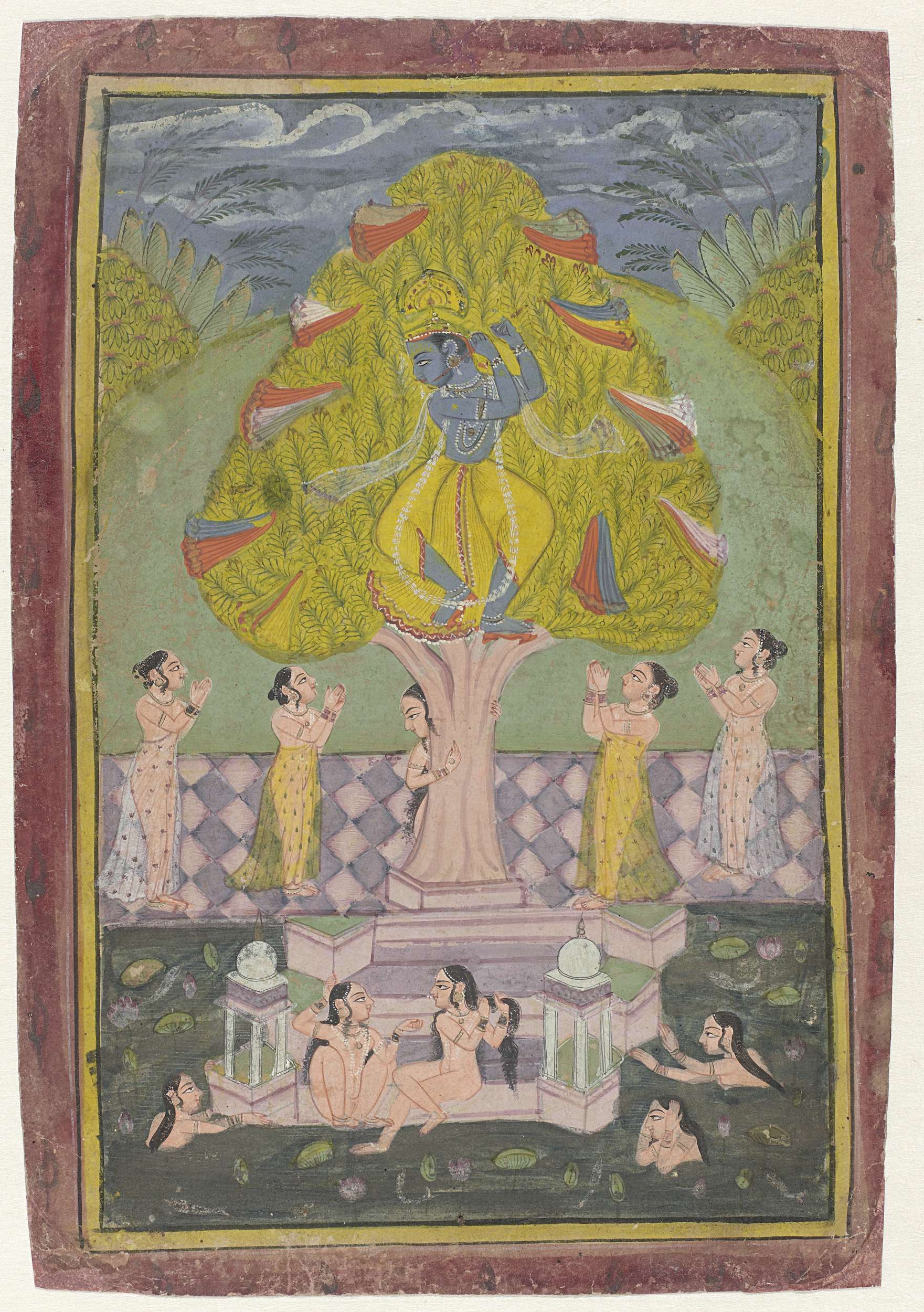 Krishna steelt de kleren van de herderinnen