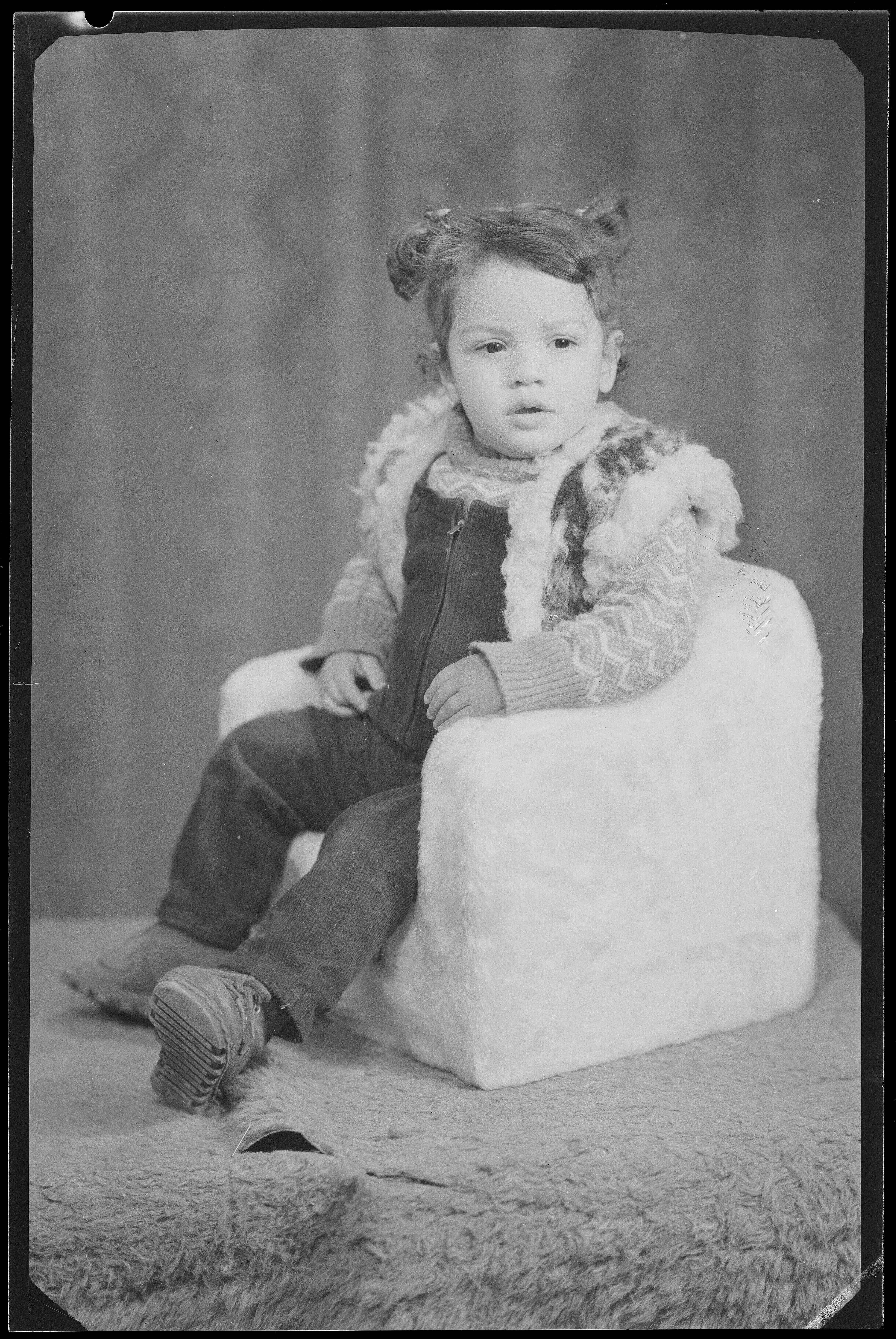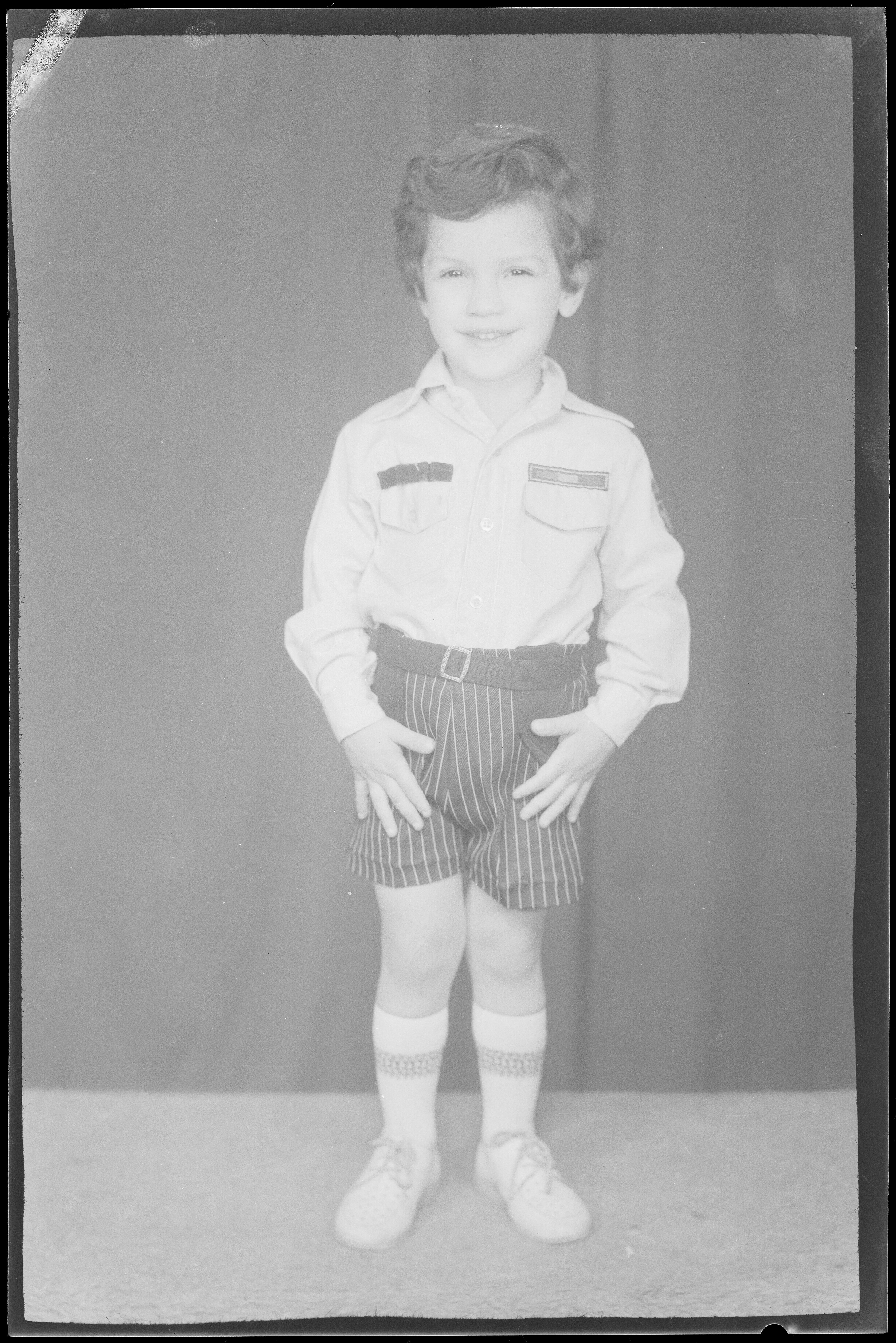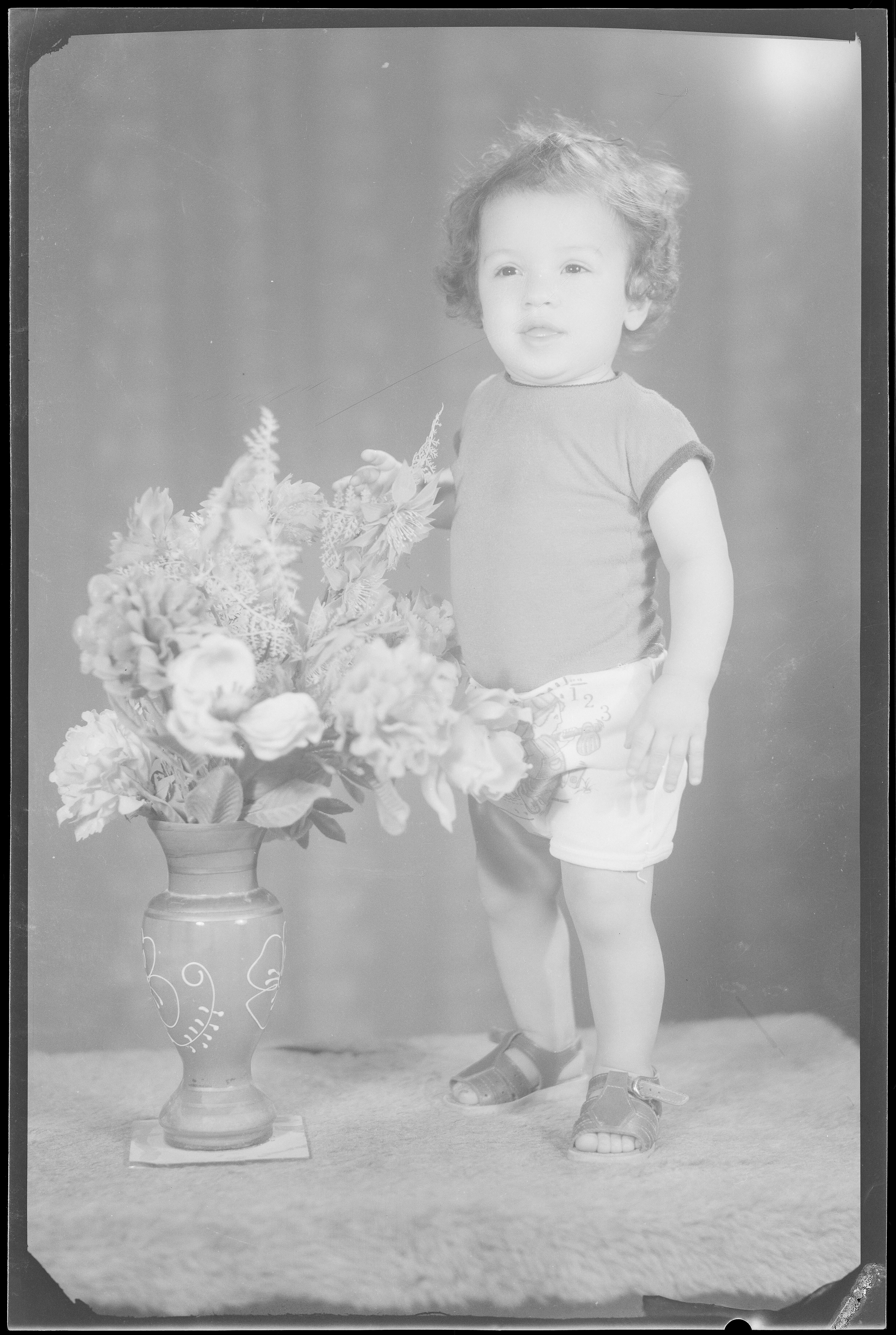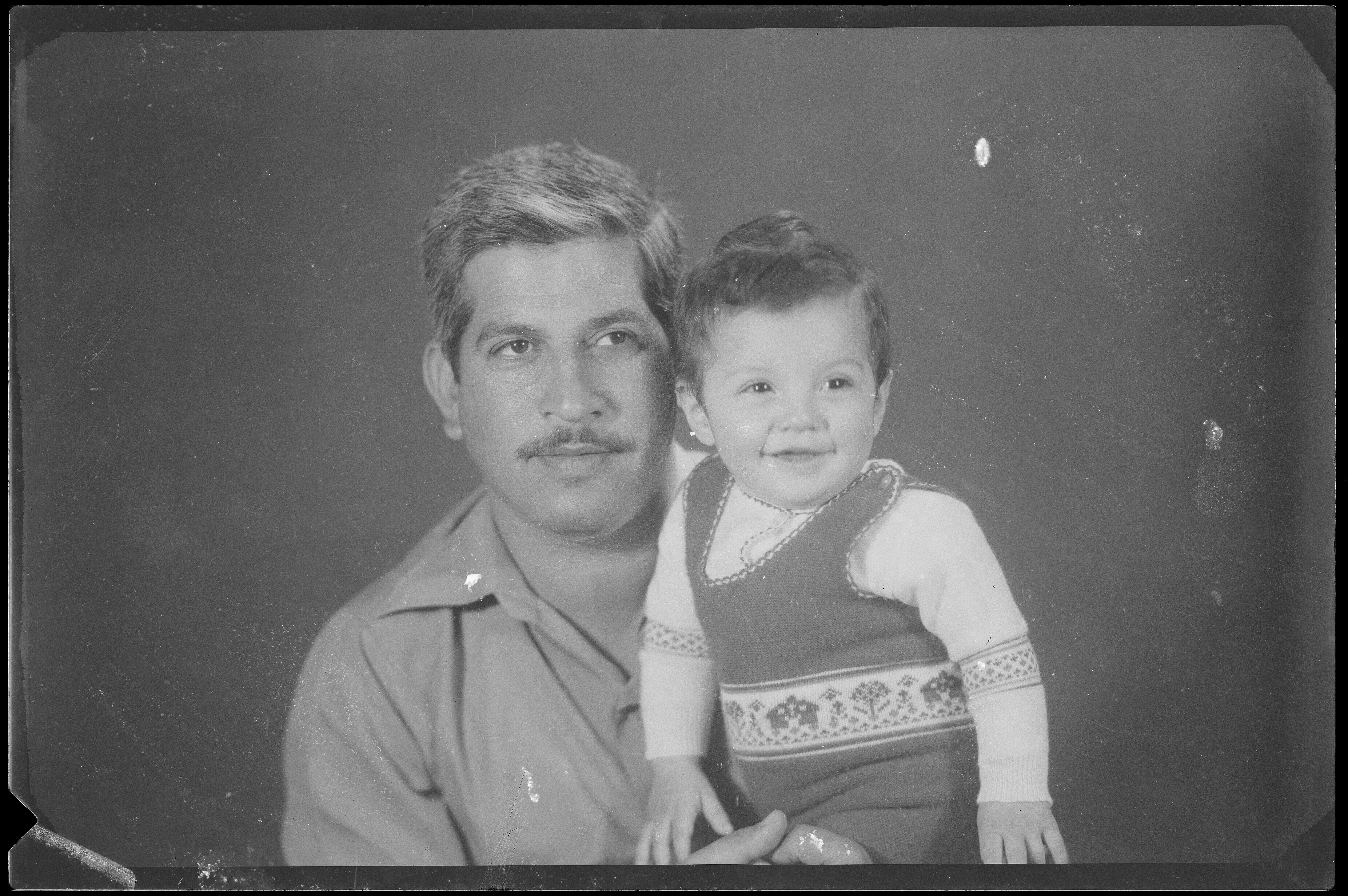Studioportret van Mohammad Yaseen op de arm van zijn...