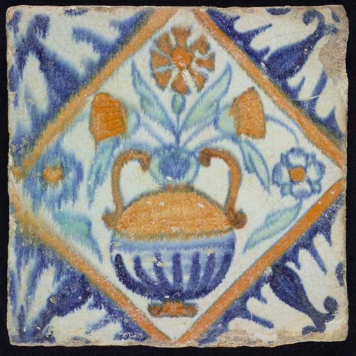 Bloemtegel, bloempot in kwadraat, hoekmotief palmet