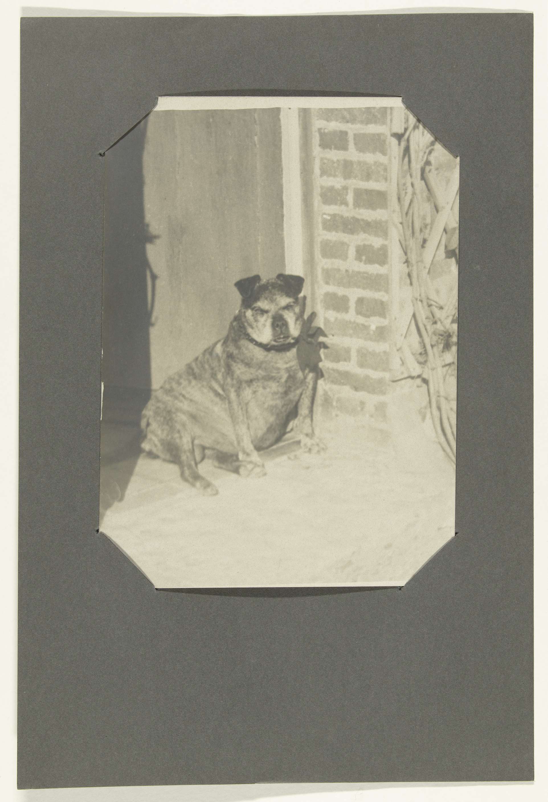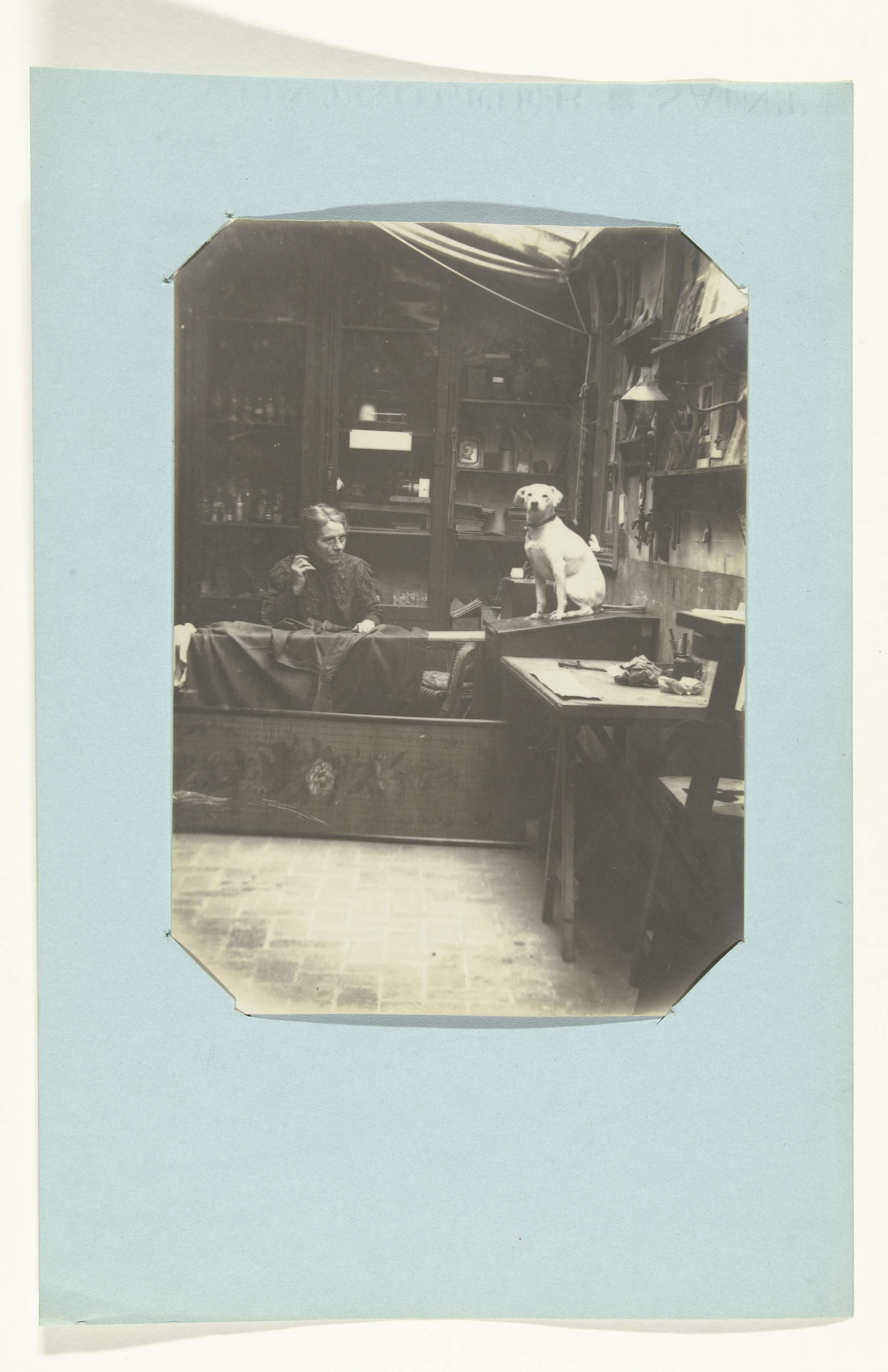 Portret van een onbekende vrouw met naaiwerk en hond...