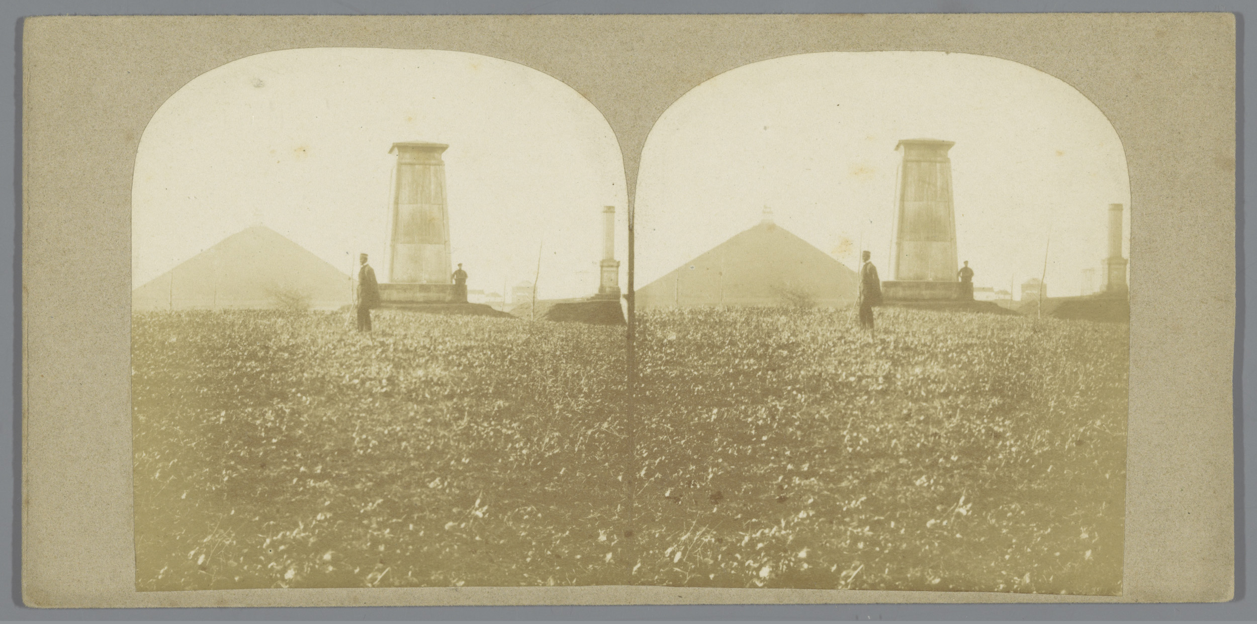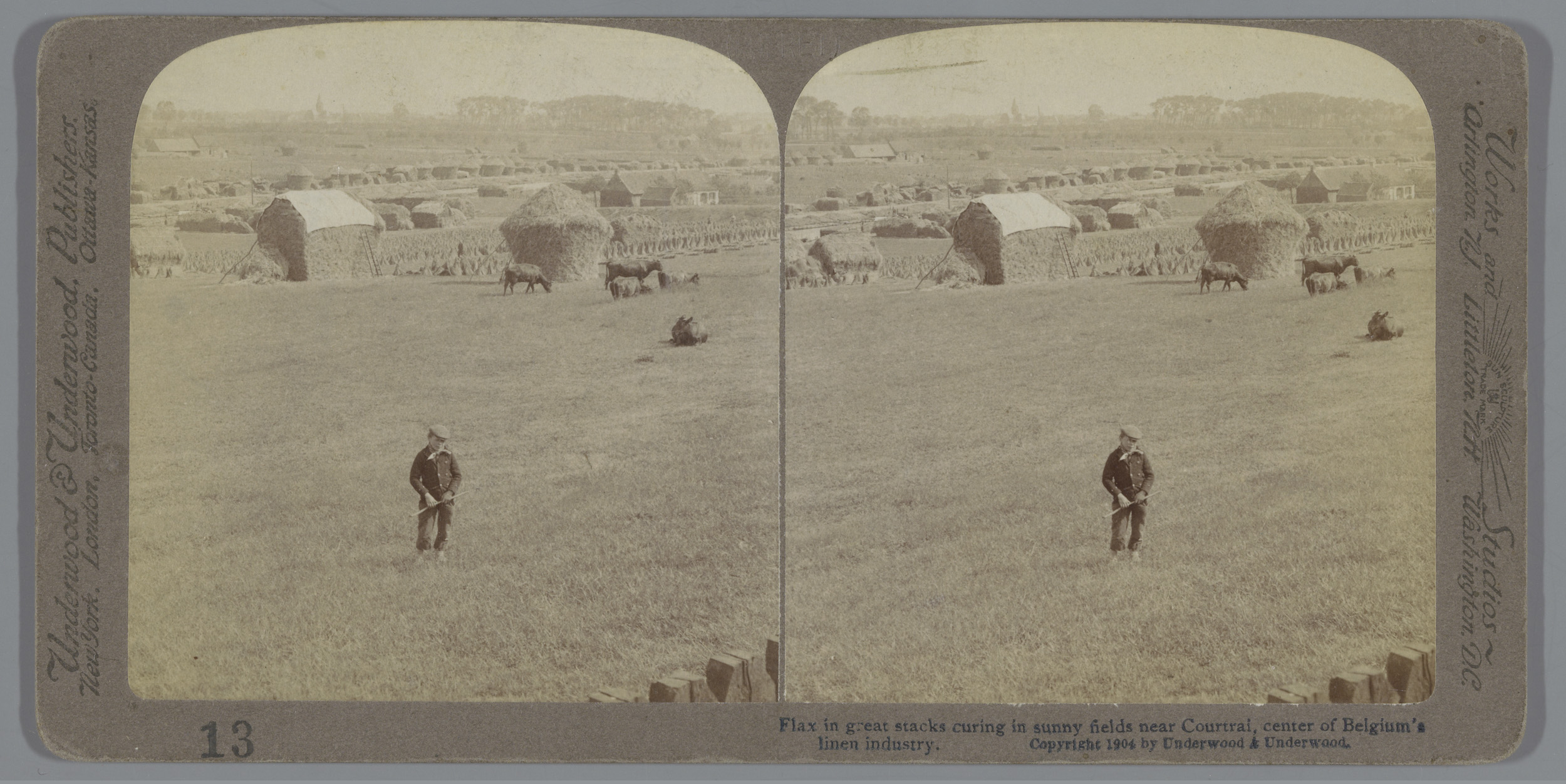Gezicht op een veld met vlasstapels bij Kortrijk, he...