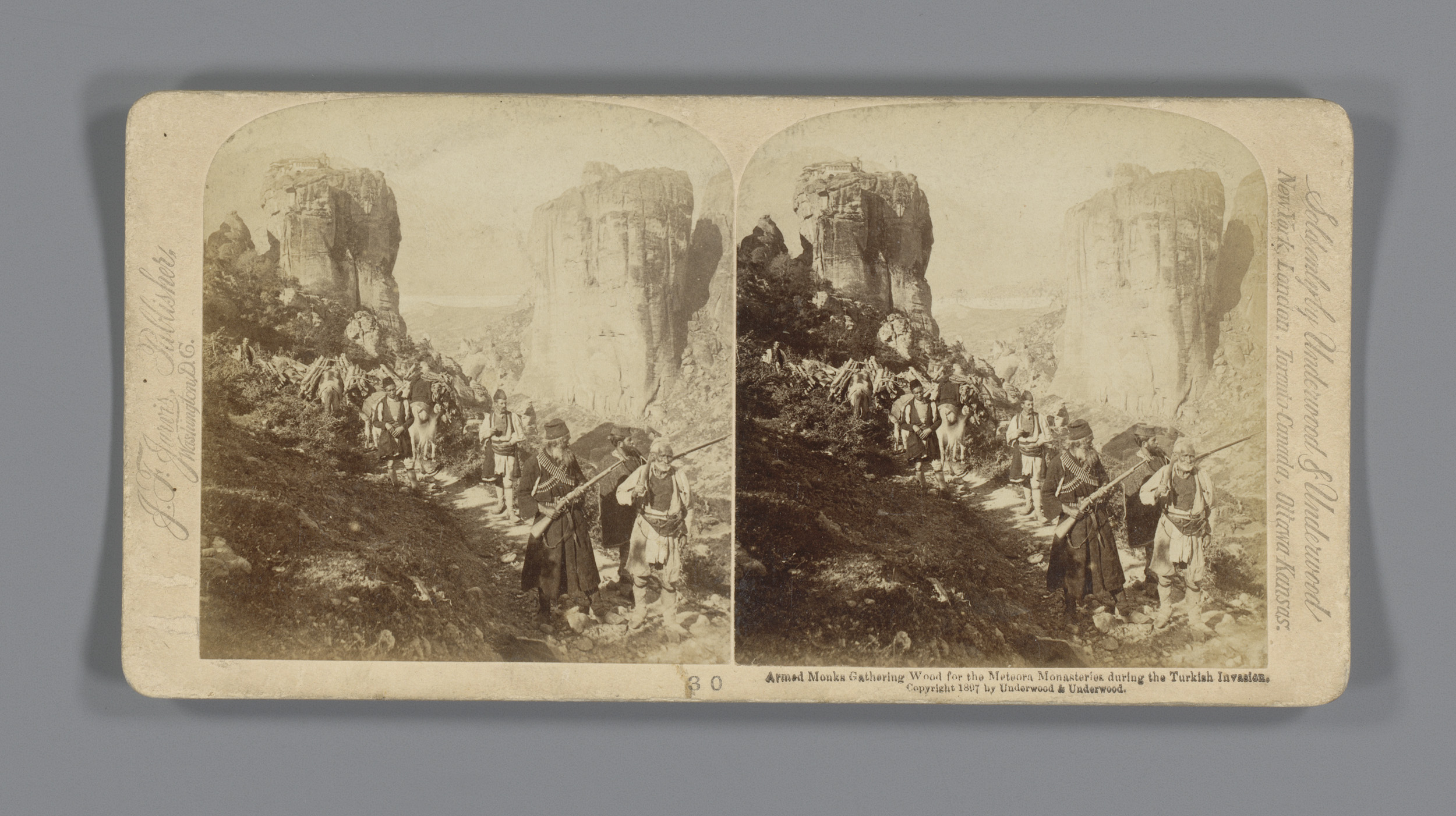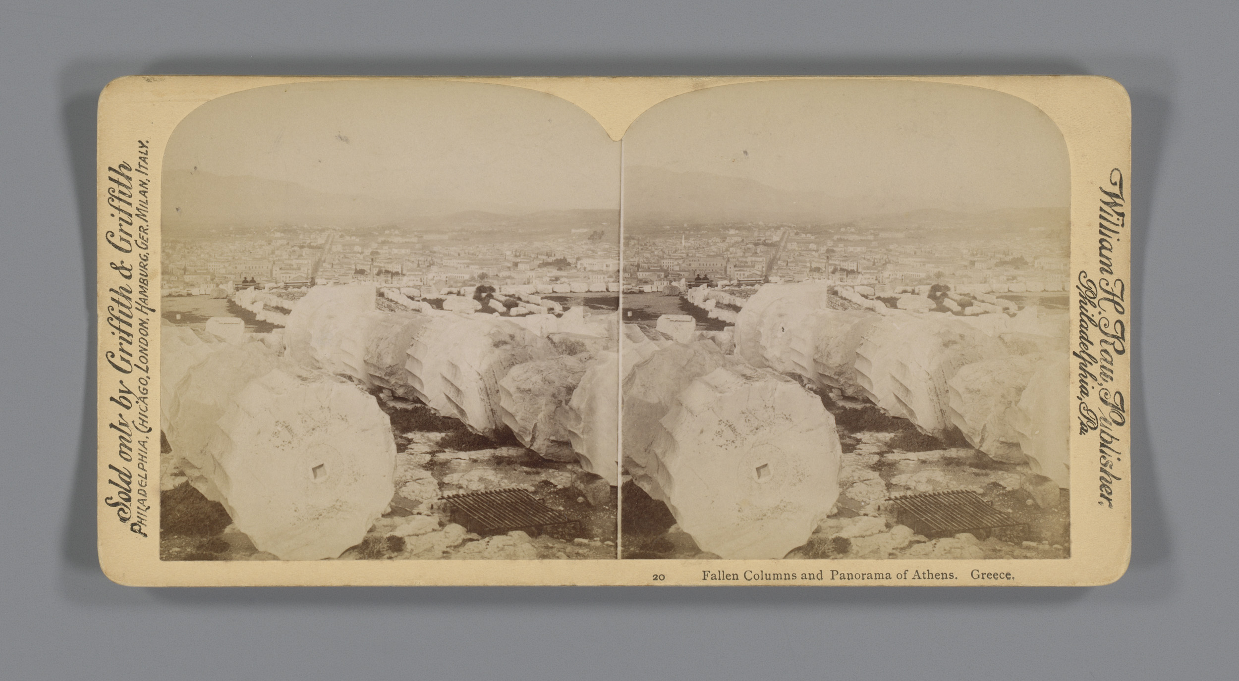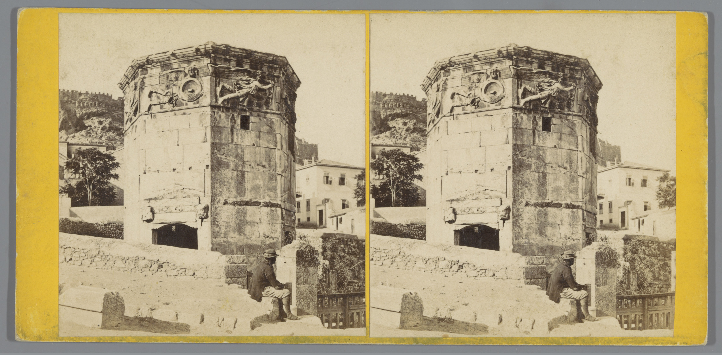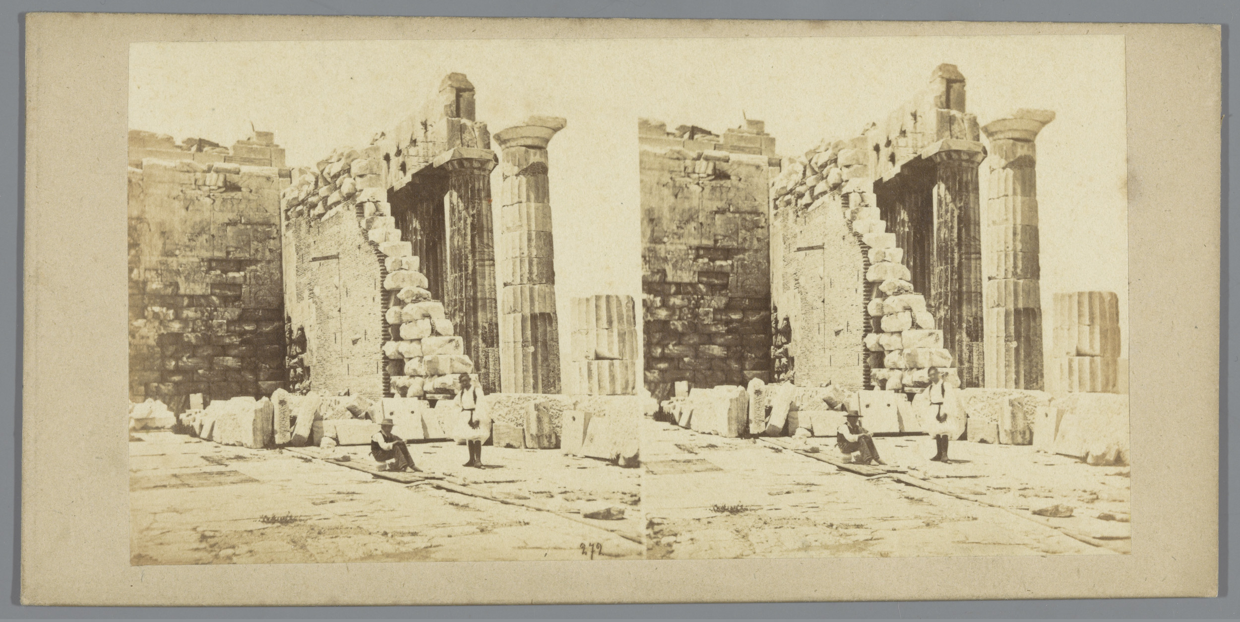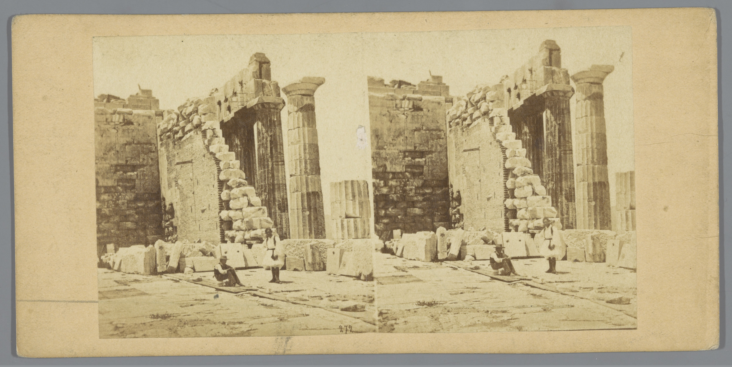 Gezicht op de zuilen van een tempelruïne met daarach...